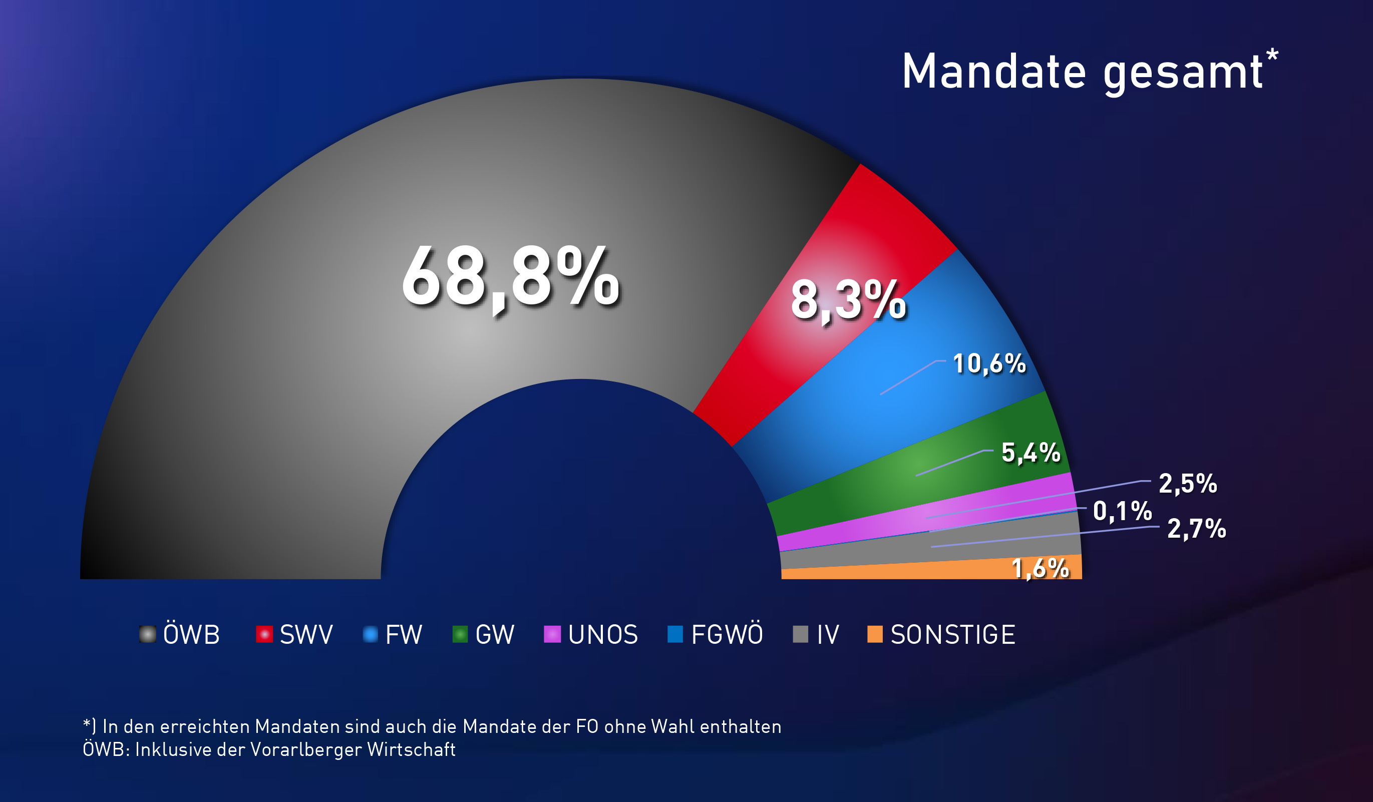 • Österreichischer Wirtschaftsbund (ÖWB): 121.223 oder 61,3 Prozent, das bedeutet ein Minus von 7,9 Prozent gegenüber den Wahlen 2020