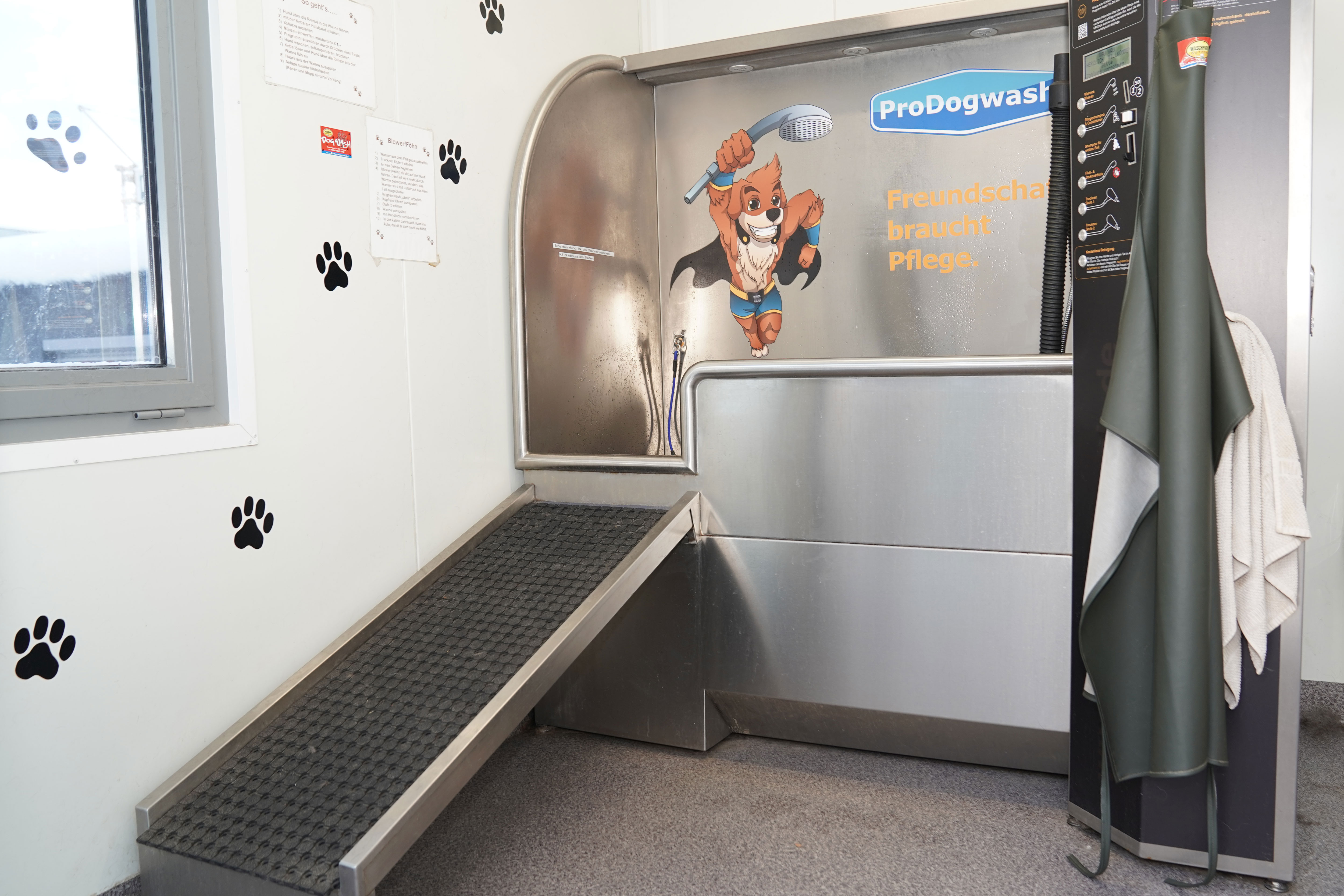 Mittels einer speziellen Installation können die Vierbeiner ganz einfach über eine Rampe in das Becken klettern und angeleint werden. Der Rest funktioniert wie eine normale, wenn auch außergewöhnlich aussehenden, Dusche. Sogar verschiedene Shampoos und Duschgels gibt es für die Hunde.