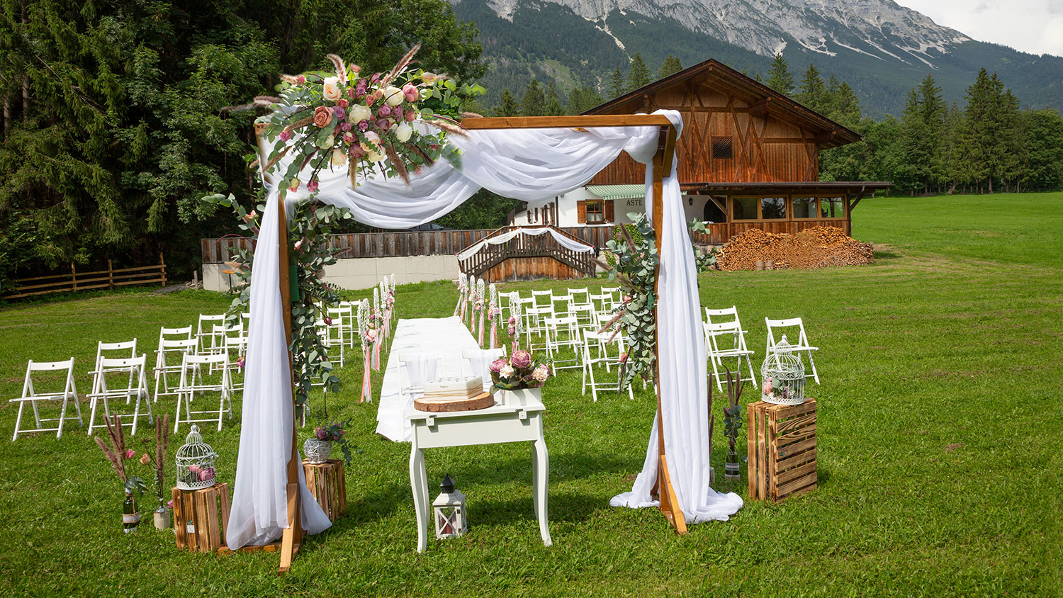 Am Fuße des Karwendels liegt die Bogner Aste. Lange Zeit war die Eventlocation, die sich mitten auf einer großen Waldlichtung in Mils befindet, ein Geheimtipp. Seit einigen Jahren hat sich unter Brautpaaren in spe herumgesprochen, dass es sich dort besonders gut feiern lässt. Warum das so ist? „Wir haben um die Bogner Aste herum 20.000 m2 grüne Wiese, ich bezeichne sie gern als Märchenwiese. Hier kann man im Freien feiern, mitten in der Natur, ganz ungezwungen und ohne einen Nachbarn zu stören“, beschreibt Hausherrin Verena Norz-Strasser die Niederalm.