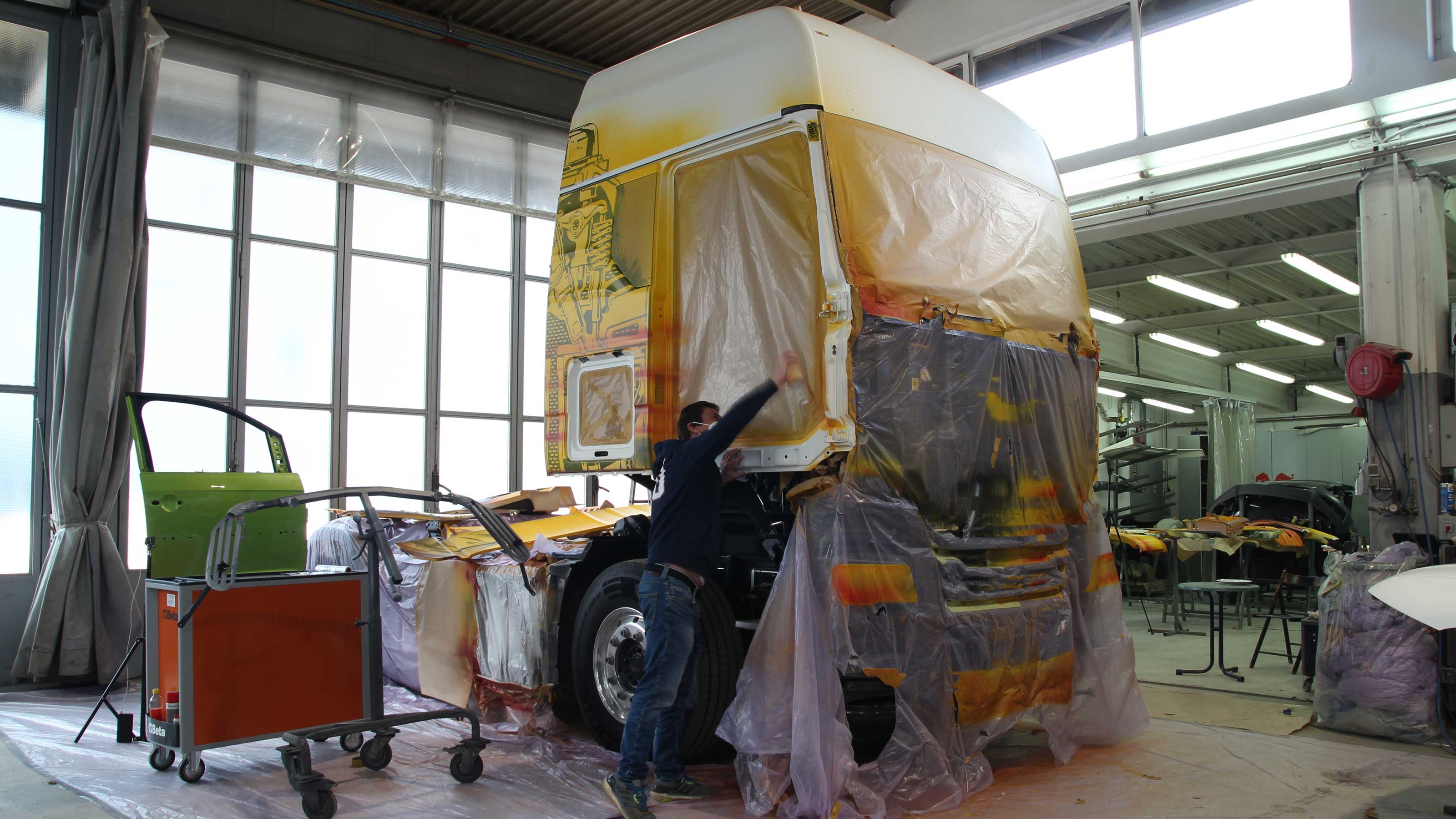 Das zweite spannende Projekt entstand gemeinsam mit dem befreundeten Airbrush-Künstler Knud Tiroch. „Für die Imster Autofrächterei Silo Melmer haben wir mehr als 20 LKW, Auflieger, Sattel- und Zugmaschinen komplett design-lackiert. Von Knud kamen die Entwürfe und Deigns, also der komplette künstlerische Teil, während ich für die Lackierung verantwortlich war. Einige dieser Fahrzeuge wurden international ausgezeichnet. Viele haben diese bunten Laster bei ihrer Fahrt durchs Land schon einmal gesehen“, weiß der Landesinnungsmeister.