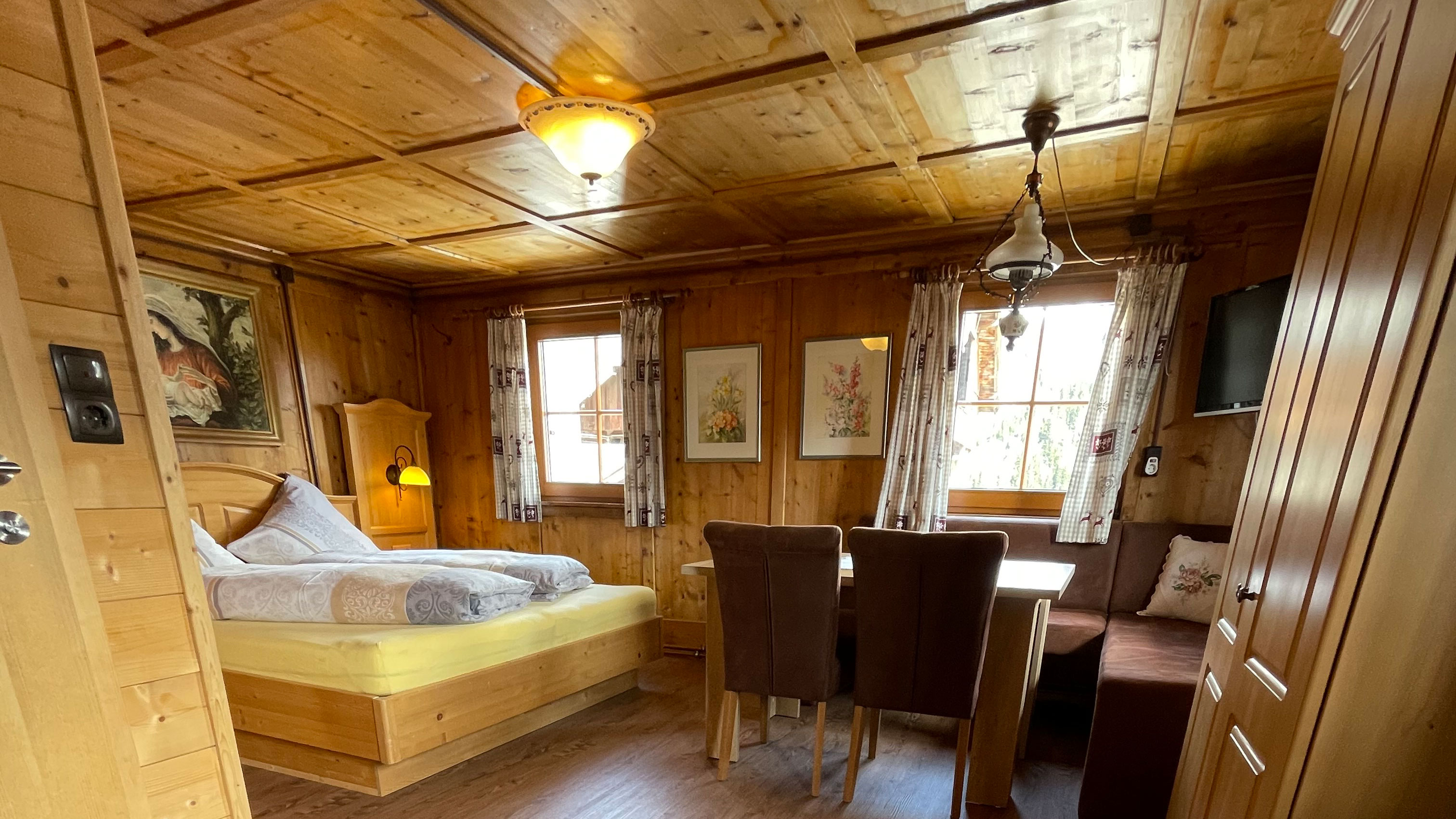 „Wir haben bei der Planung und Umsetzung größten Wert darauf gelegt, den Charakter des im traditionellen Kalser Baustil errichteten Wohngebäudes zu erhalten und in den bestehenden Zimmern die teilweise alten und von den Gästen besonders geschätzten Wand- und Deckenvertäfelungen zu belassen, sie aber sorgsam zu sanieren. Die alten Balken und Holzriegel-Innenwände wurden sandgestrahlt und dadurch aufgehellt, weshalb sie nun viel besser zur Geltung kommen. Wo es notwendig war, erfolgten Ergänzungen mit Altholz bzw. mit neuen, gehackten Holzbalken. Besonders herausfordernd war der Einbau bzw. die Erneuerung der Sanitärräume, die trotz dem recht begrenzten Platzangebot nicht nur funktionell, sondern auch optisch überzeugen mussten“, berichtet der junge Gastgeber.