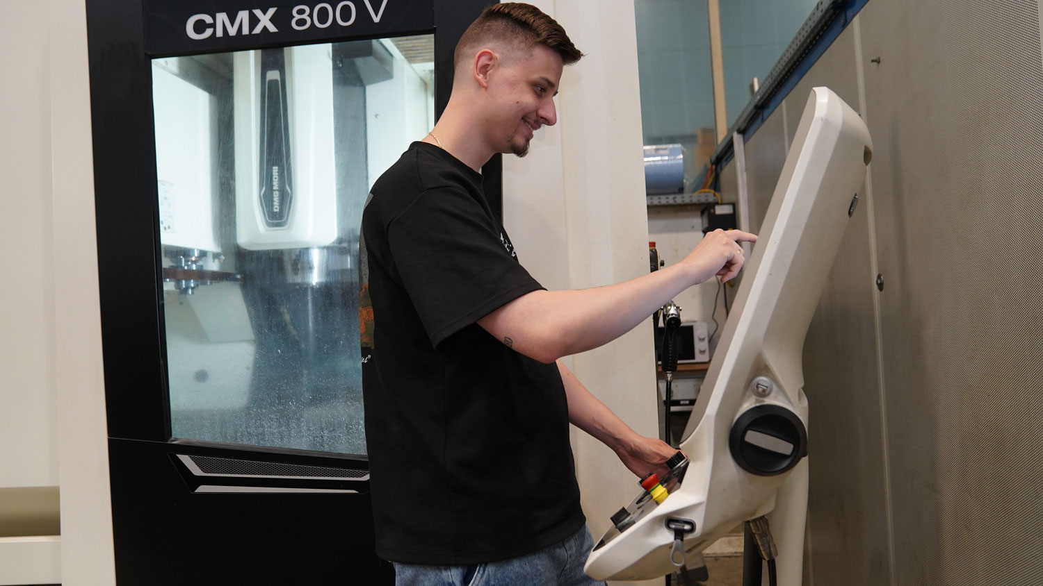 Benedikt Wander ist 25 Jahre und kommt aus Völs. Er wiederum hatte zuerst zwei Semester Chemie hinter sich, bevor er seinem Kindheitstraum folgte: Schon als Kind war er von Dokus über Tunnelbaumaschinen fasziniert. So war klar: CNC-Maschinen und Metalltechnik waren sein Ding. Nach einem Schnuppertag bei Liebherr konnte er sein Potenzial zeigen – und startete seine Lehre.