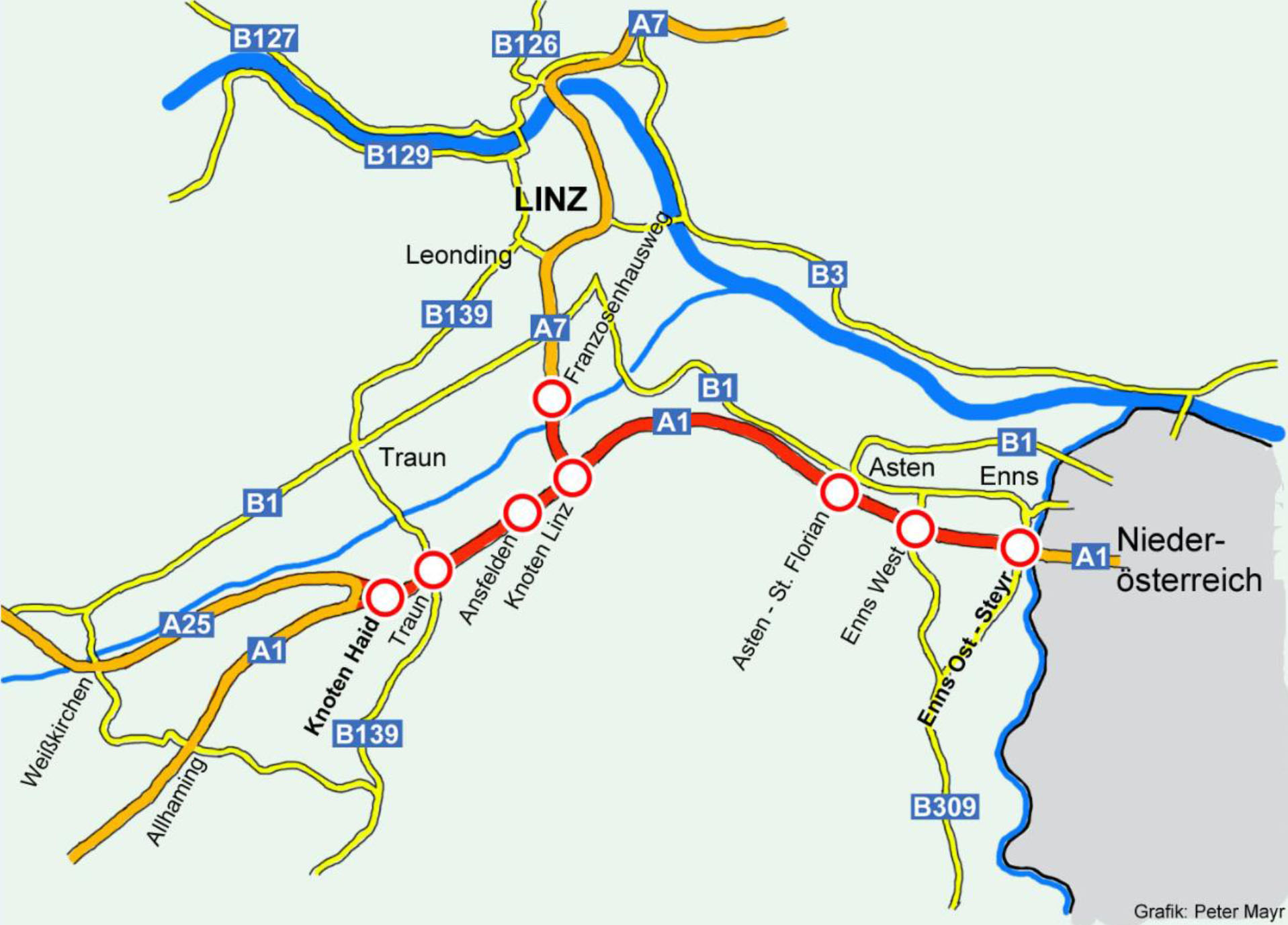 Das Fahrverbot ist per 1.7.2016 für LKW über 3,5 höchst zulässiges Gesamtgewicht (hzG) der Euroklassen 0 - 2 auf der A1 Westautobahn zwischen der Anschlussstelle Enns-Steyr (Kilometer 154,996) und dem Knoten Haid (Kilometer 175,574) in Kraft getreten.