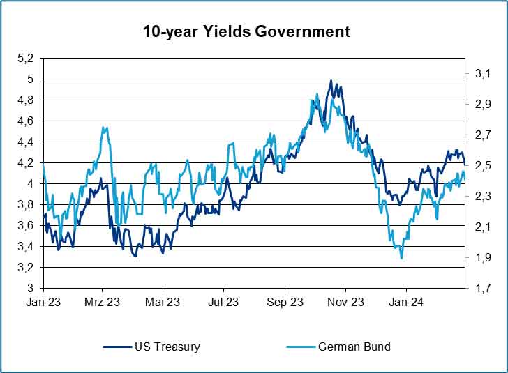 Konjunkturell verfestigte sich weiter das Bild eines "Soft-Landings" in den USA. Ende März bestätigte die Aufwärtsrevision des ohnehin robusten US-Wirtschaftswachstums im vierten Quartal 2023 die positive Marktstimmung. Bedingt durch bessere Konjunkturzahlen in Europa wird mittlerweile auch keine Rezession mehr für Europa erwartet. Die frühere "Konjunkturlokomotive" Deutschland schwächelt jedoch weiterhin u.a. aufgrund der Exportabhängigkeit des Autosektors, der unter der aktuellen Schwäche Chinas leidet.