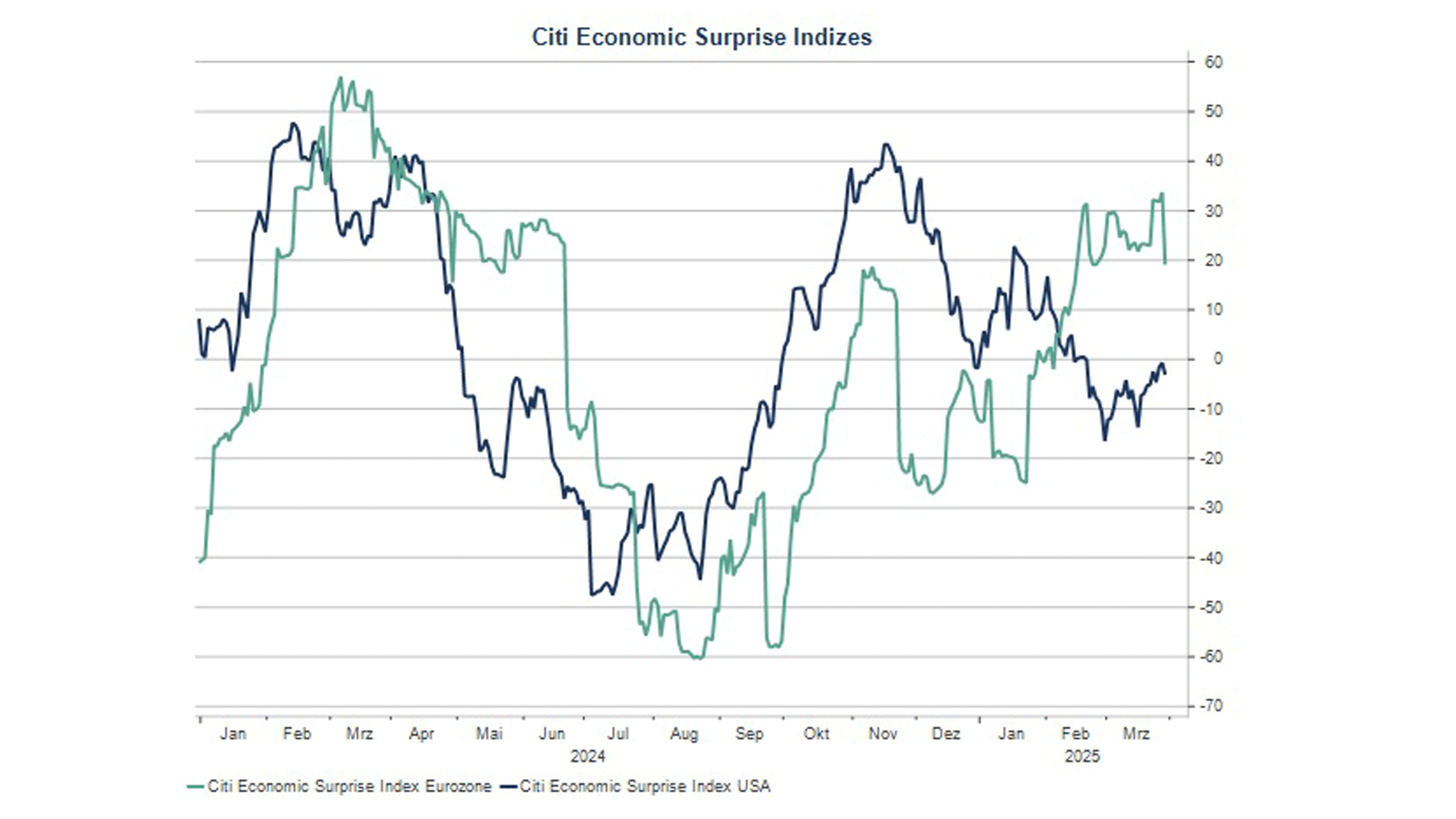 All diese Themen führten zu vermehrter Unsicherheit, die sich zunehmend auf Konsumentenumfragen und Wirtschaftsdaten negativ auswirkten. In den USA wurden die Erwartungen seit Jahresbeginn zunehmend verfehlt, während für Europa die Realisierungen besser als erwartet ausgefallen sind.