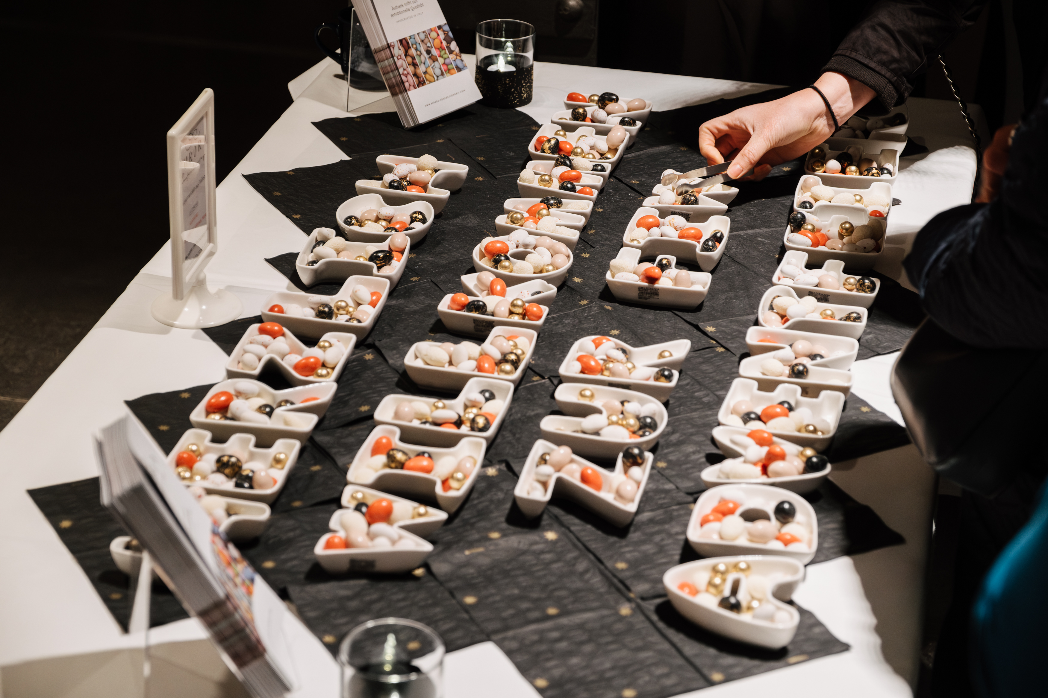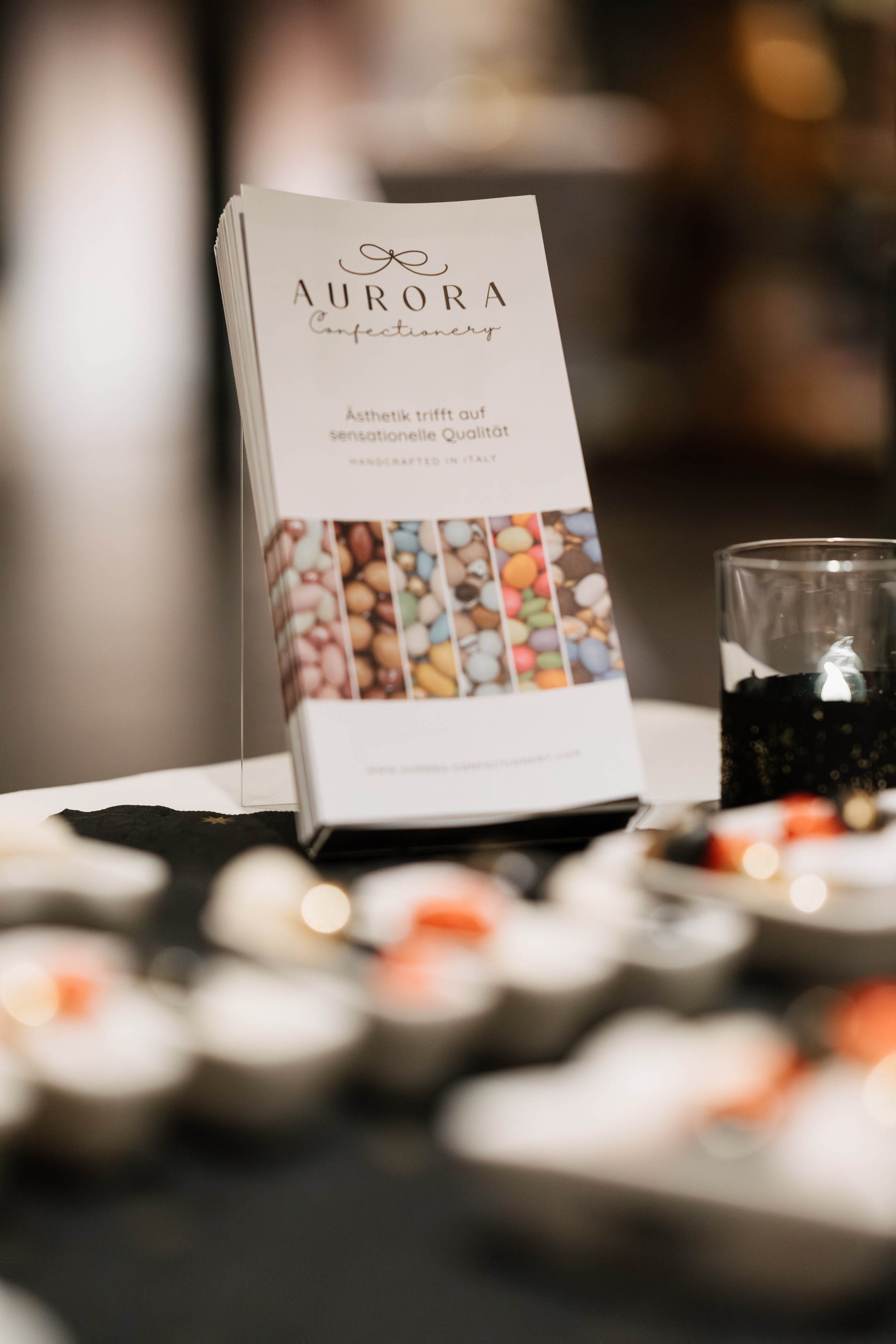Als besonderen Empfang im Freien mit Feuerschalen, Glühwein und Punsch begrüßten bunte und leckere „Zuckermandeln“ von Aurora Tedesco die Gäste beim Einlass.