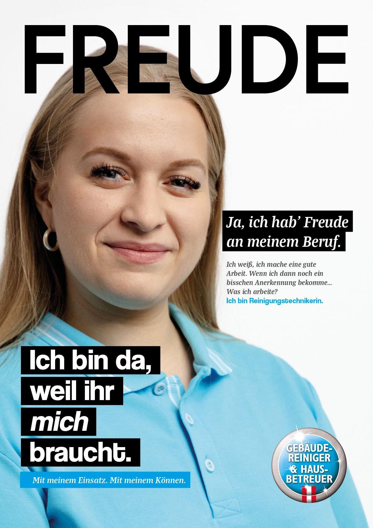 Der Reinigungstechniker:in ist da, weil die Gesellschaft ihn braucht. In Radiospots, TV Spots und Printsujets zeigen wir, was wir leisten.