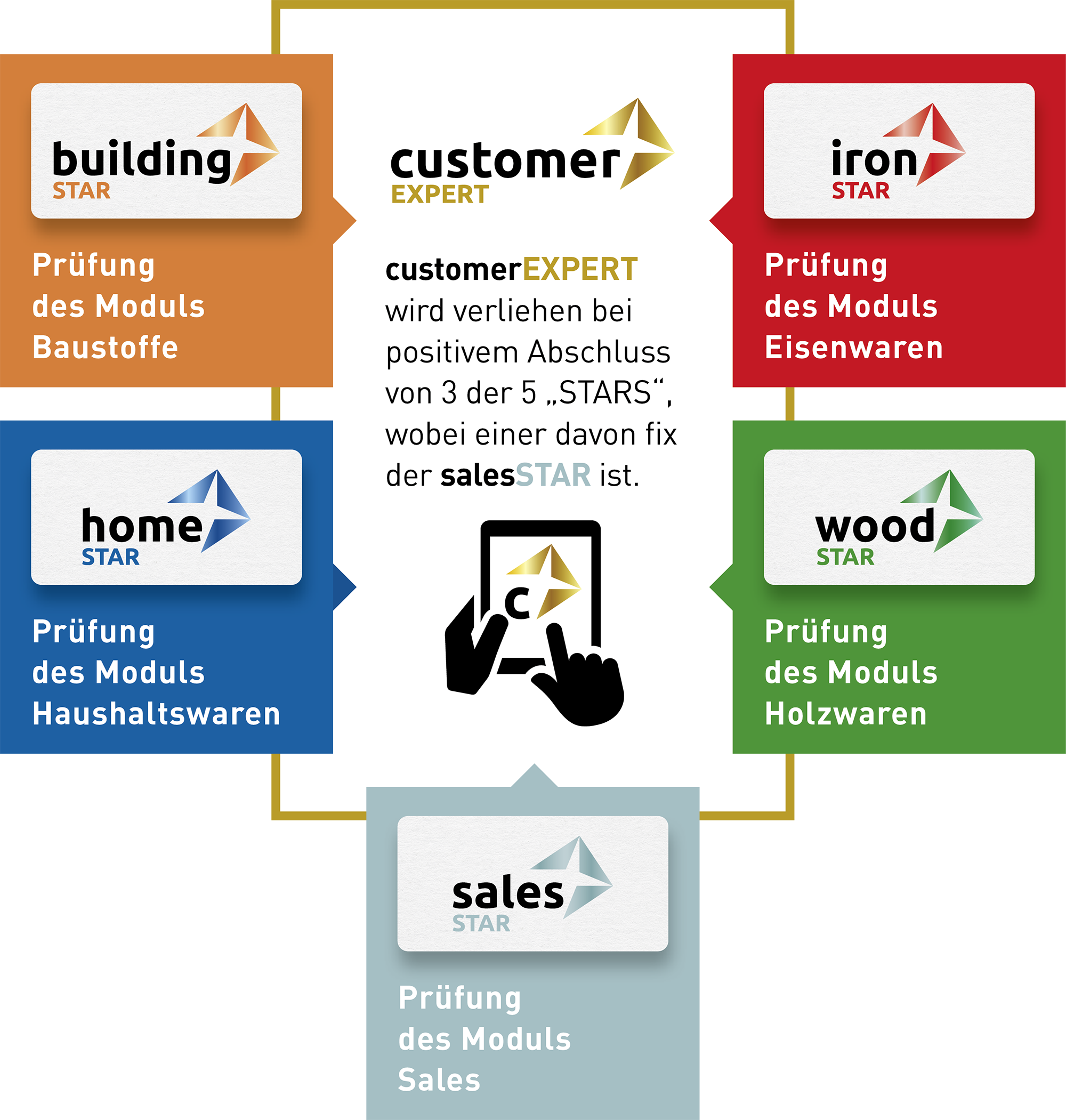 Der customerEXPERT vermittelt umfangreiches Wissen in den Bereichen des Baustoff-, Eisenwaren-, Haushaltswaren- und Holzhandels sowie in Wirtschaftskunde und kaufmännischem Rechnungswesen. Die Inhalte und Multiple-Choice Fragen wurden von Lehrern didaktisch erarbeitet und von Fachexperten begleitet. Nach erfolgreich bestandener Prüfung über die Fachbereiche erlangt der Absolvent ein STAR-Zertifikat.