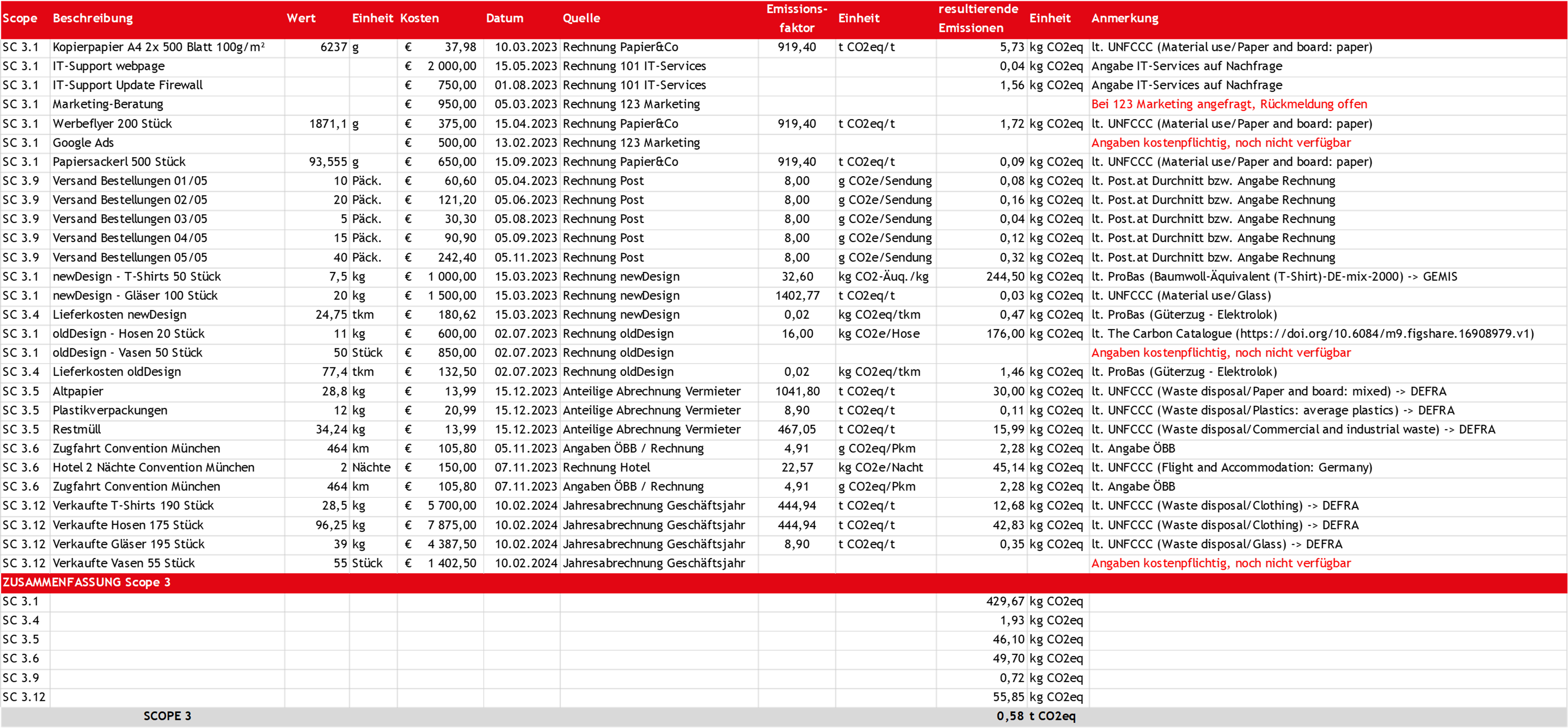 Man erkennt gleich, in diesem Beispiel sind ein paar der Kategorien überhaupt nicht erfasst, wie z.B. Anreise der Mitarbeiter:innen (SC 3.7) oder nachgelagerter Transport durch Kund:innen (SC 3.9). Auch fehlen (wie im ersten Anlauf oft) einige Emissionsfaktoren – z.B. weil sie nur in kostenpflichtigen Datenbanken hinterlegt sind, für die Sie möglicherweise kein Budget zur Verfügung stehen haben. Auch die Emissionen der Energienvorkette (SC 3.3) müssen noch ergänzt werden.