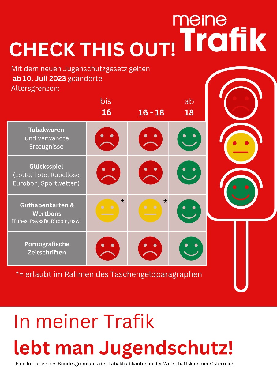 Seit dem 1.1.2019 ist der Verkauf von Tabakwaren und verwandten Erzeugnissen – also neuartigen Tabakerzeugnissen, pflanzlichen Raucherzeugnissen sowie der elektronischen Zigarette und deren Liquids – an Personen unter 18 Jahren gesetzlich verboten. Mit 10.7.2023 haben die Österreichischen Lotterien bundesweit das Mindestalter für die Produkte Lotto, Toto, Rubbellose und Co auf 18 Jahren angepasst.
