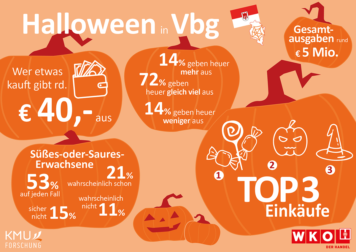 Laut einer aktuellen Erhebung der KMU Forschung Austria werden rund um den 31. Oktober im Vorarlberger Einzelhandel Gesamtausgaben von etwa fünf Millionen Euro erwartet. Das entspricht etwa 40 Euro pro Person, pro Halloween-Einkauf. Damit liegen die geplanten Ausgaben über dem Niveau des Vorjahres: Knapp zwei von zehn Konsumentinnen und Konsumenten wollen heuer mehr ausgeben als im vergangenen Jahr, sieben von zehn planen ein ähnliches Budget wie 2024.
