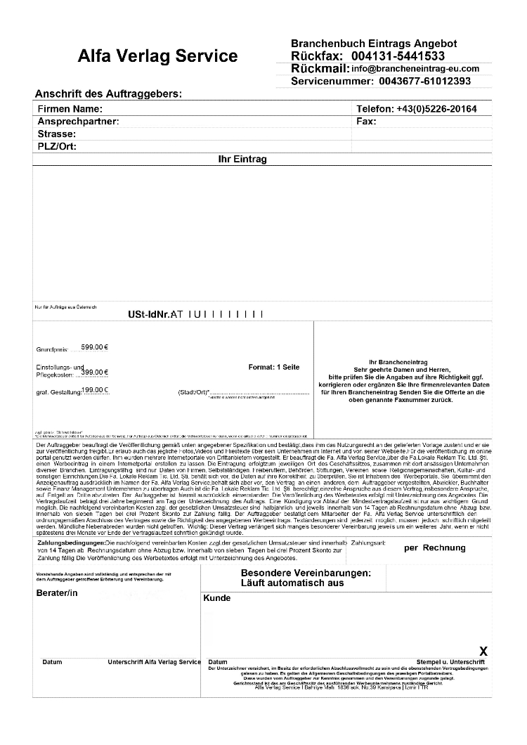 Ein Mitgliedsbetrieb wurde vom „Alfa Verlag Service“ telefonisch kontaktiert. Im Zuge des unerbetenen Anrufs wurde behauptet, dass bereits ein Vertrag bestehe und sich dieser verlängere, wenn nicht zeitnah mit einem übermittelten Formular gekündigt wird. In Wahrheit handelt es sich bei diesem Formular um ein verschleiertes Angebot über eine Eintragung in ein Online-Branchenregister. Mit der Unterschrift verpflichtet sich das Mitglied, halbjährlich einen bestimmten Betrag über den Zeitraum von drei Jahren zu bezahlen.
