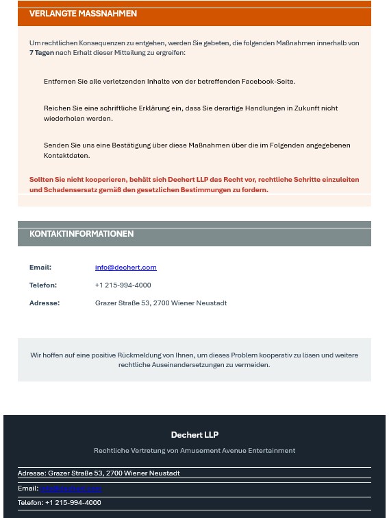 Derzeit werden gezielt Unternehmen per E-Mail kontaktiert und mit rechtlichen Konsequenzen wegen angeblicher Urheberrechtsverstöße auf Facebook bedroht. Die E-Mails geben sich als offizielle Mitteilungen von renommierten Kanzleien wie Dechert LLP oder Linklaters LLP aus.