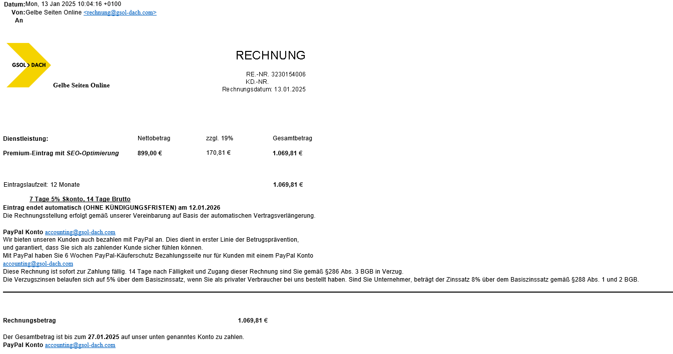 Momentan werden vom Mail-Account „Gelbe Seiten Online“ E-Mails verschickt, in denen Kosten für Einträge mit SEO-Optimierung angeführt werden. Mitgliedsbetriebe werden aufgefordert, den Rechnungsbetrag an accounting@gsol-dach.com zu überweisen.