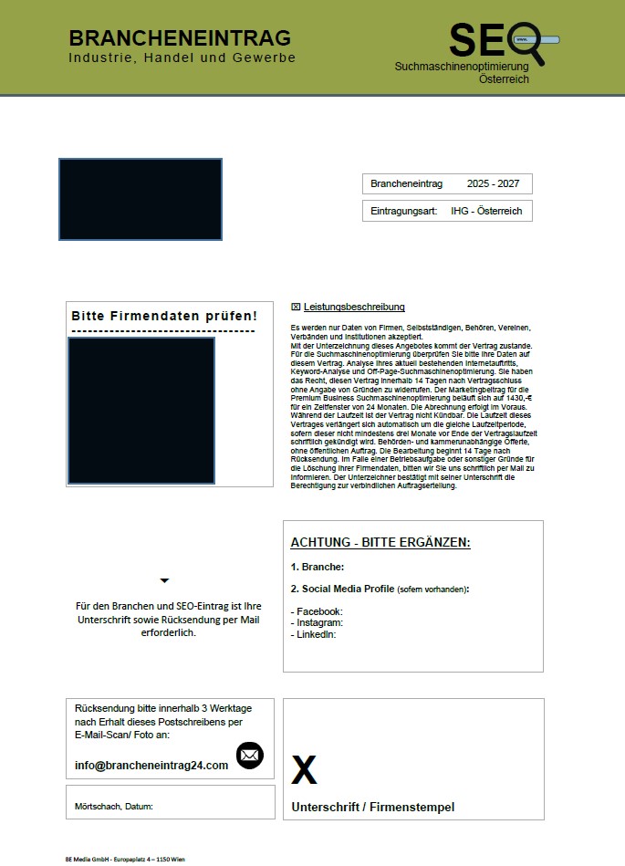 Momentan sind gefälschte Brancheneinträge im Umlauf, die per Mail vom Absender info@brancheneintrag24.com verschickt werden. Im Anhang der E-Mail befindet sich ein Dokument, das Mitglieder werden gebeten werden auszufüllen und zur Datenaktualisierung ihres Brancheneintrags an die BE Media GmbH zu retournieren.