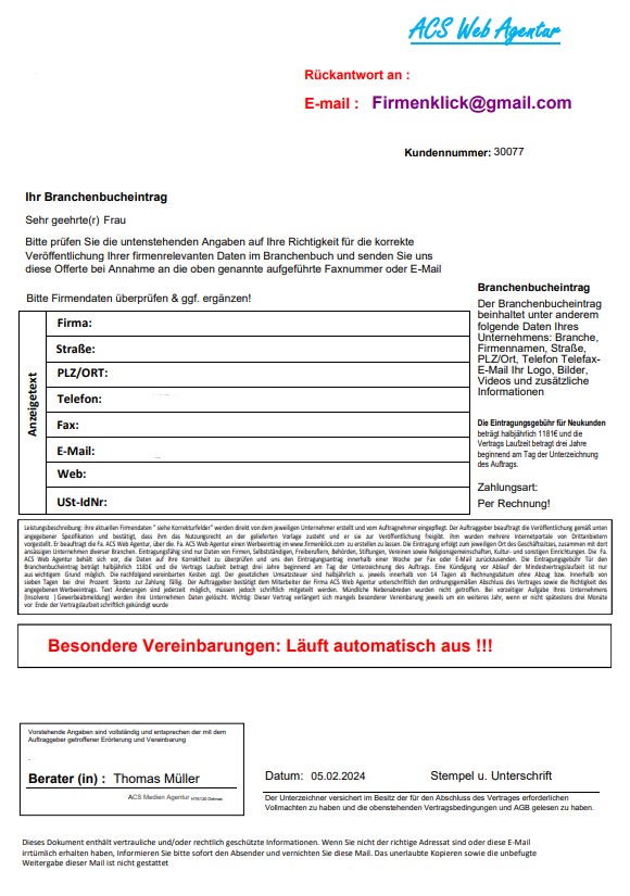 Wenn Sie Anrufe oder ein Schreiben von der "ACS Web Agentur" erhalten, unterschrieben Sie nicht und zahlen Sie bitte nichts ein.