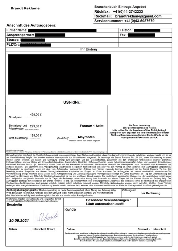 Hier wird – wie bei vielen anderen Erlagscheinwerbungen – die Ergänzung von Daten in einem öffentlichen Branchenregister, wie z.B. in den „Gelben Seiten“, suggeriert. Der Vertrag wird aber tatsächlich erst durch die Unterschrift abgeschlossen und beauftragt. In Wirklichkeit handelt es sich hier nämlich um ein reines Angebot für eine Neueintragung in ein Branchenregister, das kostenpflichtig ist.