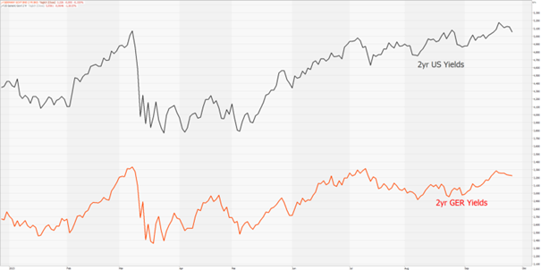 Die Rendite 10-jähriger US-Staatsanleihen stieg seit Jahresbeginn von 3,3 % auf zuletzt 4,7 %, die Rendite 10-jähriger deutscher Staatsanleihen stieg von 2,4 % unter zyklischen Schwankungen auf zuletzt 2,9 %.