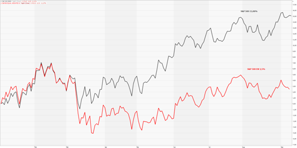 Ein Vergleich des bekannten kapitalisierungsgewichteten S&P 500 (graue Linie) mit der gleichgewichteten Version dieses Index (equal weight, rote Linie) zeigt bis September eine Differenz von 12,5 %-Punkten.
