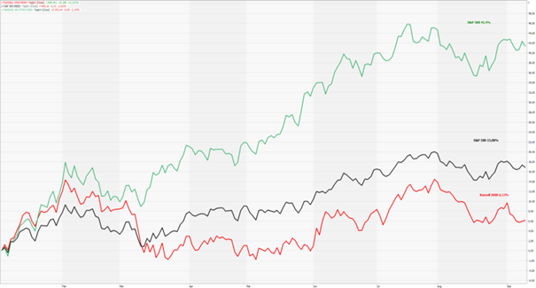 Zwischen den Marktsegmenten und Sektoren gibt es ebenfalls eine große Spreizung der Kursgewinne, SmallCap-Aktien etwa sind seit März abgeschlagen: Nasdaq +41 %, S&P500 +15 %, Russell 2000Y (in der Grafik rot) +6 % (USA).