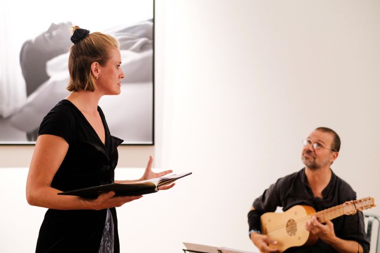 Der "Galicische Abend" lud ein ins Atelier Fé. Hier verschmolzen barocke Gitarrenklänge mit Gedichten der galicischen Autorin Luisa Villalta, die im Rahmen der Kooperation zwischen den Festivals erstmals ins Deutsche übersetzt wurden. Während des Abends wurden die Gäste mit galicischen Tapas und Weinen kulinarisch verwöhnt.