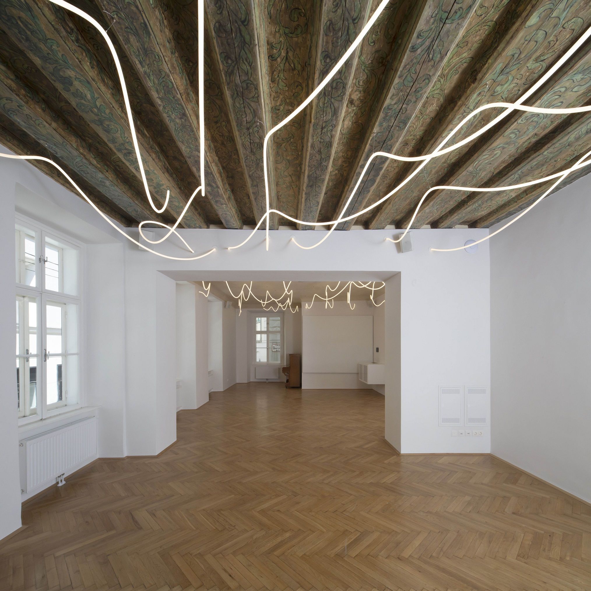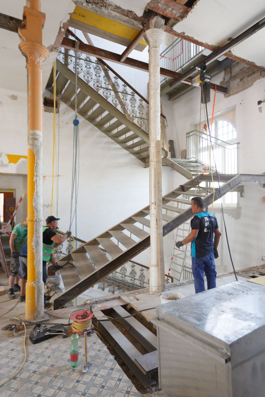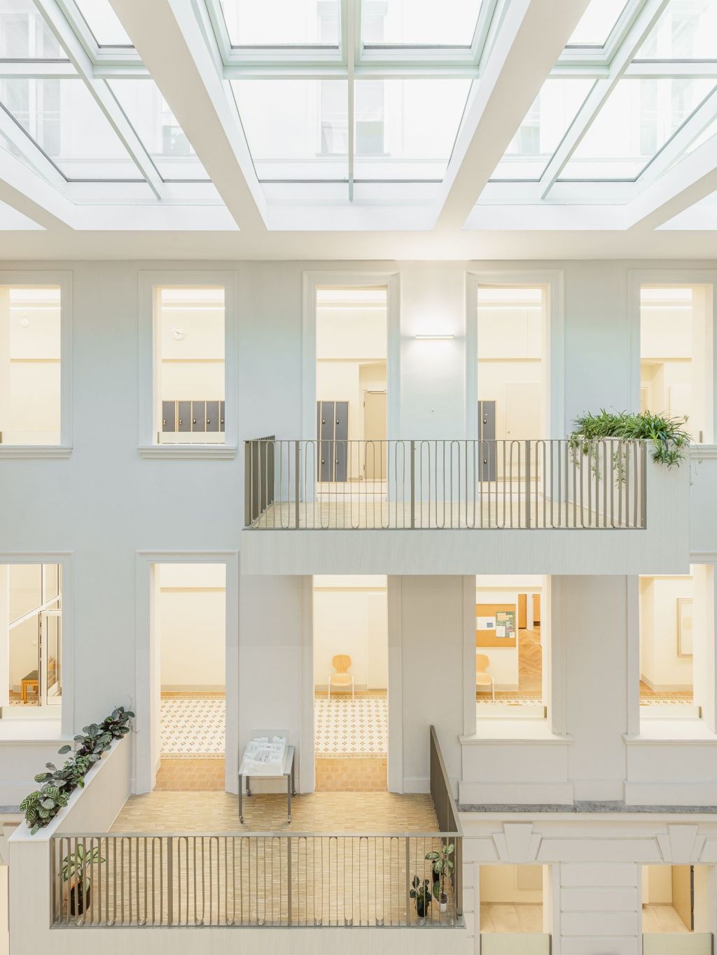 Die bestehende Tragstruktur mit ihren großen Stützweiten ermöglichte Flexibilität im Umbau und reflektiert die industrielle Vergangenheit des Hauses. Historische Bauteile wie eine goldverzierte Stuckdecke und das Prunkstiegenhaus wurden sorgsam restauriert.