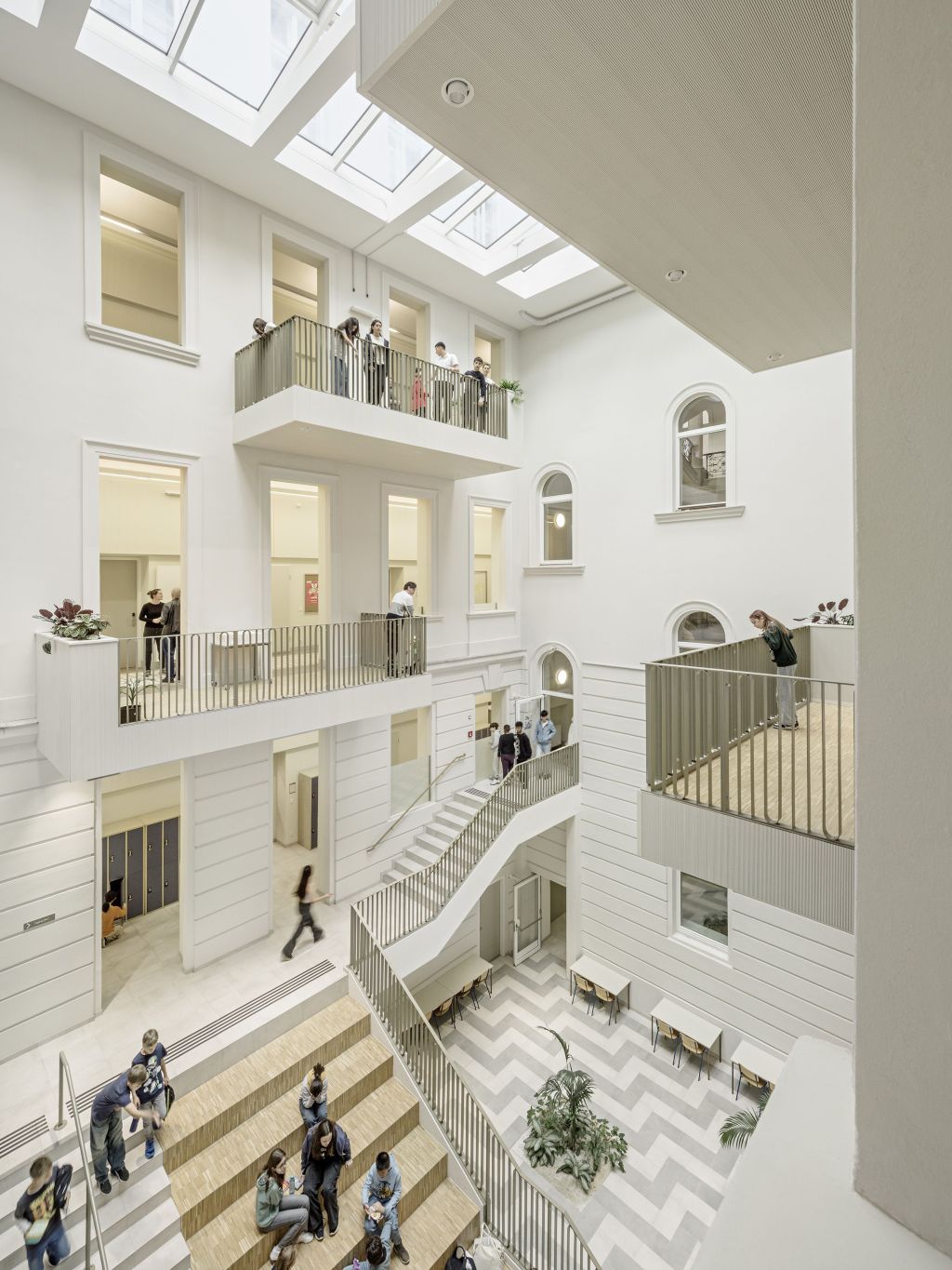 Die Generalsanierung des denkmalgeschützten Schulgebäudes aus den 1890er Jahren bewahrt den historischen Charme und verleiht dem Gebäude durch behutsame Eingriffe neues Leben. Im Zentrum der Sanierung stand die Schaffung eines lichtdurchfluteten Innenraums, der den Anforderungen des modernen Schulbetriebs gerecht wird. Der Austausch des Atriumdaches bildet einen großzügigen Luftraum, der das Erdgeschoss mit natürlichem Licht und Luft versorgt und als zentrales Element der Erschließung dient. Ergänzend wurden großzügige Pausenflächen und kleine Balkone in den Luftraum integriert, die das Raumgefühl erweitern und die sozialen Interaktionen fördern. In der neuen Aula, wo Interaktion und Sozialisierung im Vordergrund stehen, wurden Sitzstufen eingerichtet. Der Neubau eines unterirdischen Turnsaals, der Ausbau des Dachgeschosses und die Gestaltung eines neuen Vorplatzes mit einem modernen Haupteingang steigern die Nutzbarkeit des Gebäudes erheblich. Gleichzeitig bleibt die historische Fassade des Altbaus erhalten, was einen respektvollen Dialog zwischen Tradition und Moderne ermöglicht. Die erfolgreiche Integration innovativer Lösungen bei gleichzeitiger Wahrung der historischen Substanz macht dieses Projekt zu einem herausragenden Beispiel für nachhaltige Architektur, die den Anforderungen eines modernen Bildungsstandortes gerecht wird.