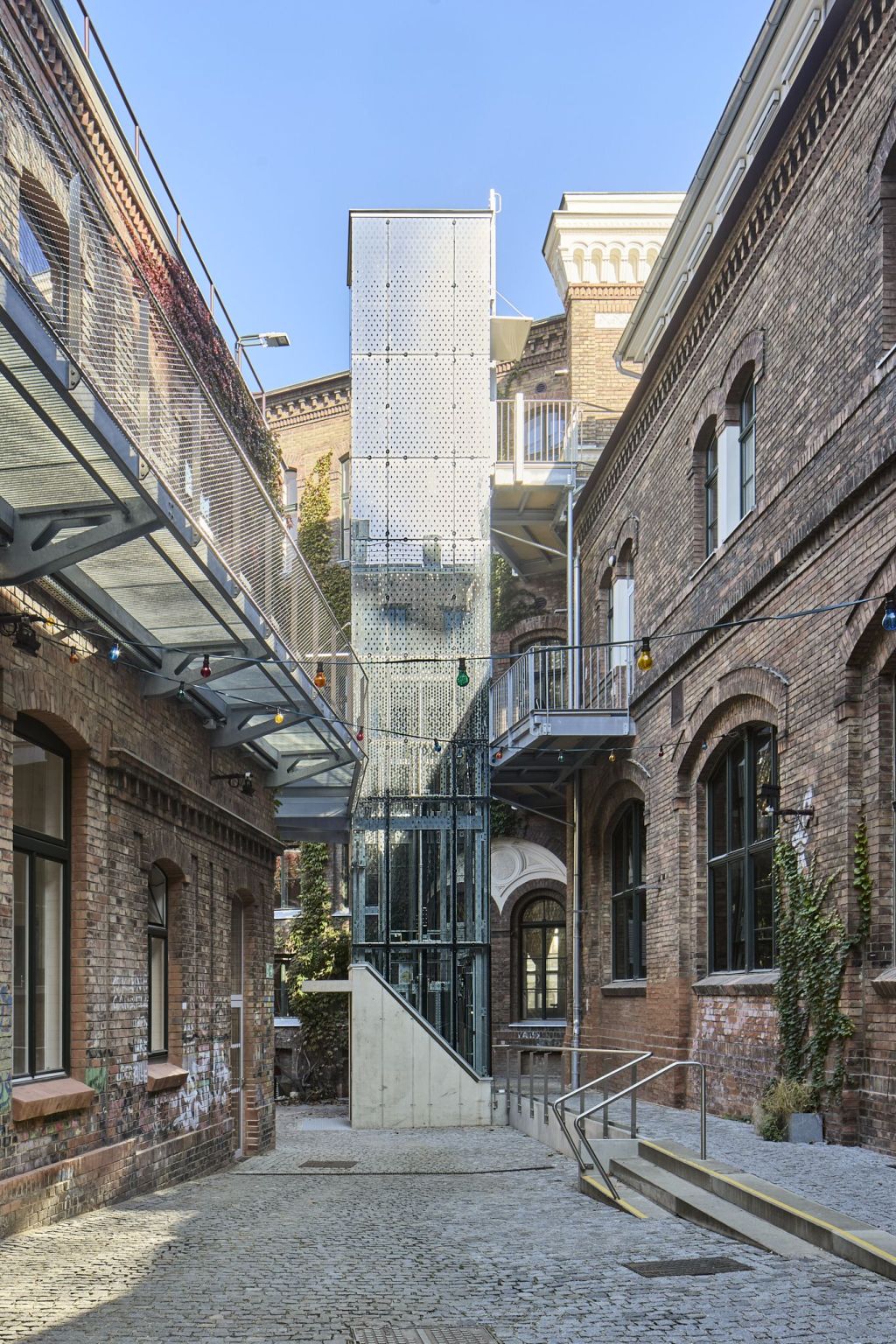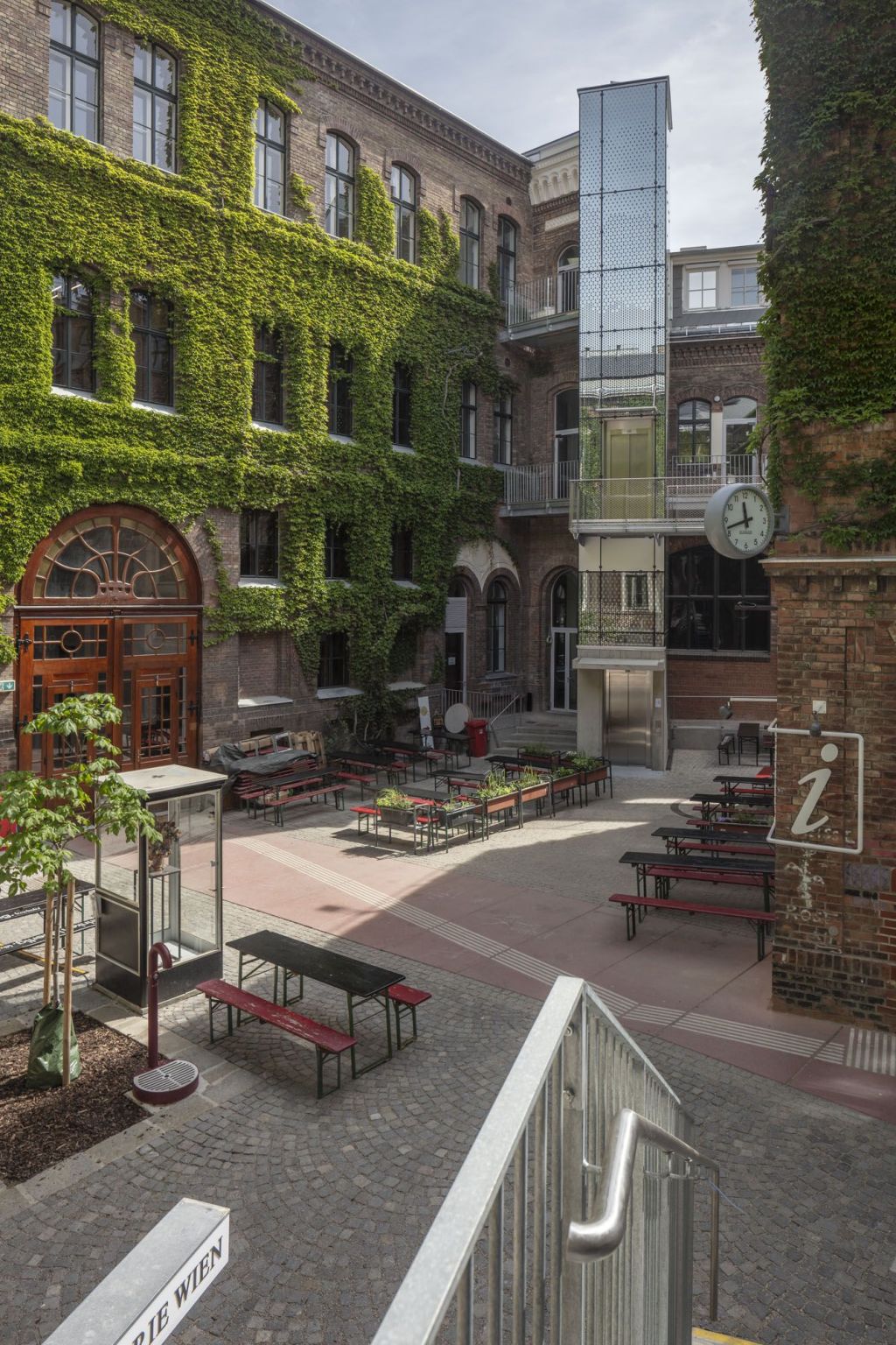 Die charakteristische Backsteinfassade des WUK wurde denkmalgerecht instandgesetzt. Neue architektonische Eingriffe wie der freistehende Aufzugsturm im Innenhof wurden so konzipiert, dass sie sich respektvoll in die historische Substanz einfügen. Die Glasfassade des Turms erzeugt eine neue visuelle Tiefe im Hof und reflektiert Himmel, Grünraum und Gebäudestruktur.
