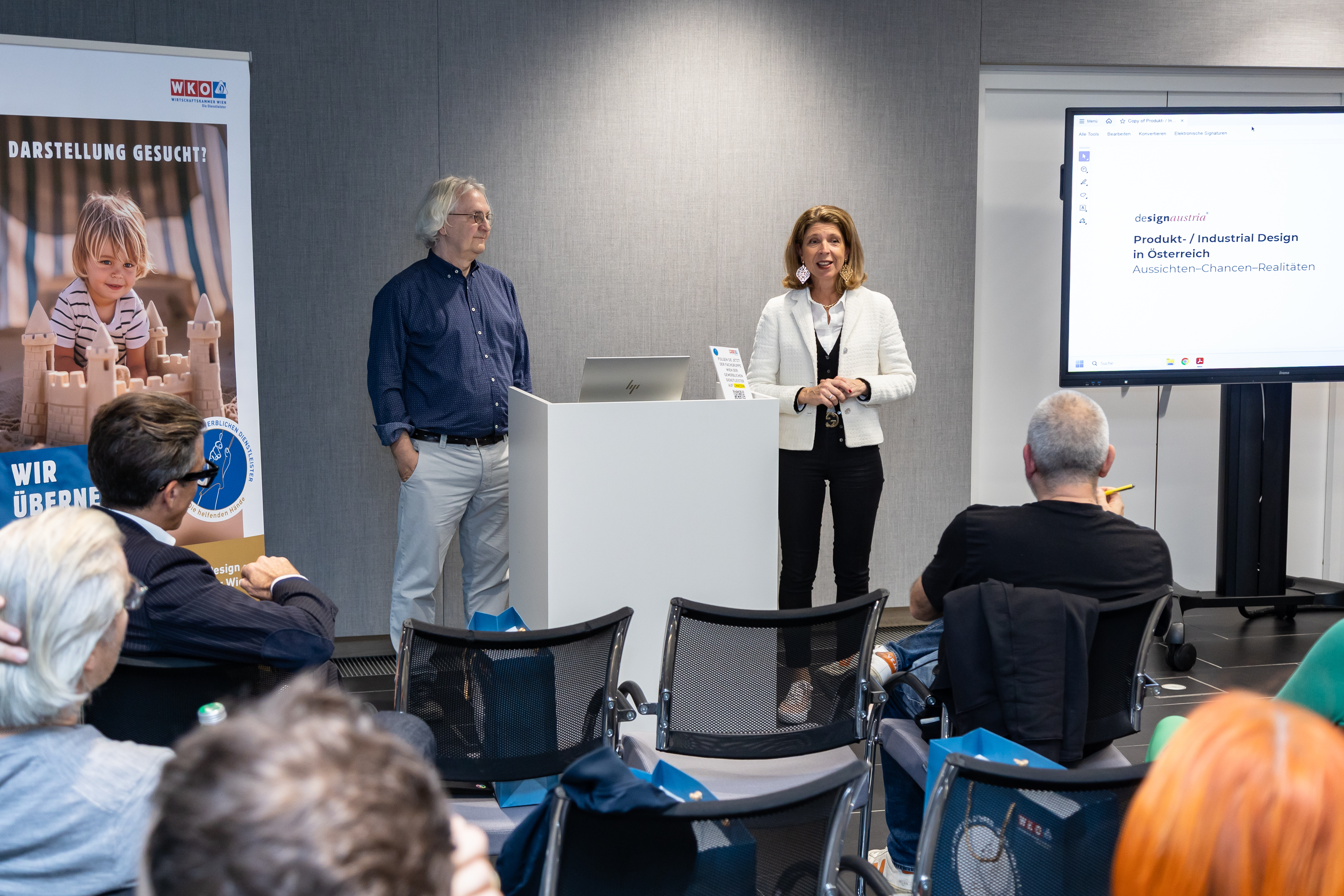 Der Abend stand ganz im Zeichen des Berufsbildes Design/Industrial Design & Zeichenbüros. Branchensprecher Herr Prof. Mag. Severin Filek begrüßte gemeinsam mit Herrn Dr. Gründl die anwesenden Teilnehmer:innen und erläuterte den Gewerbewortlaut.