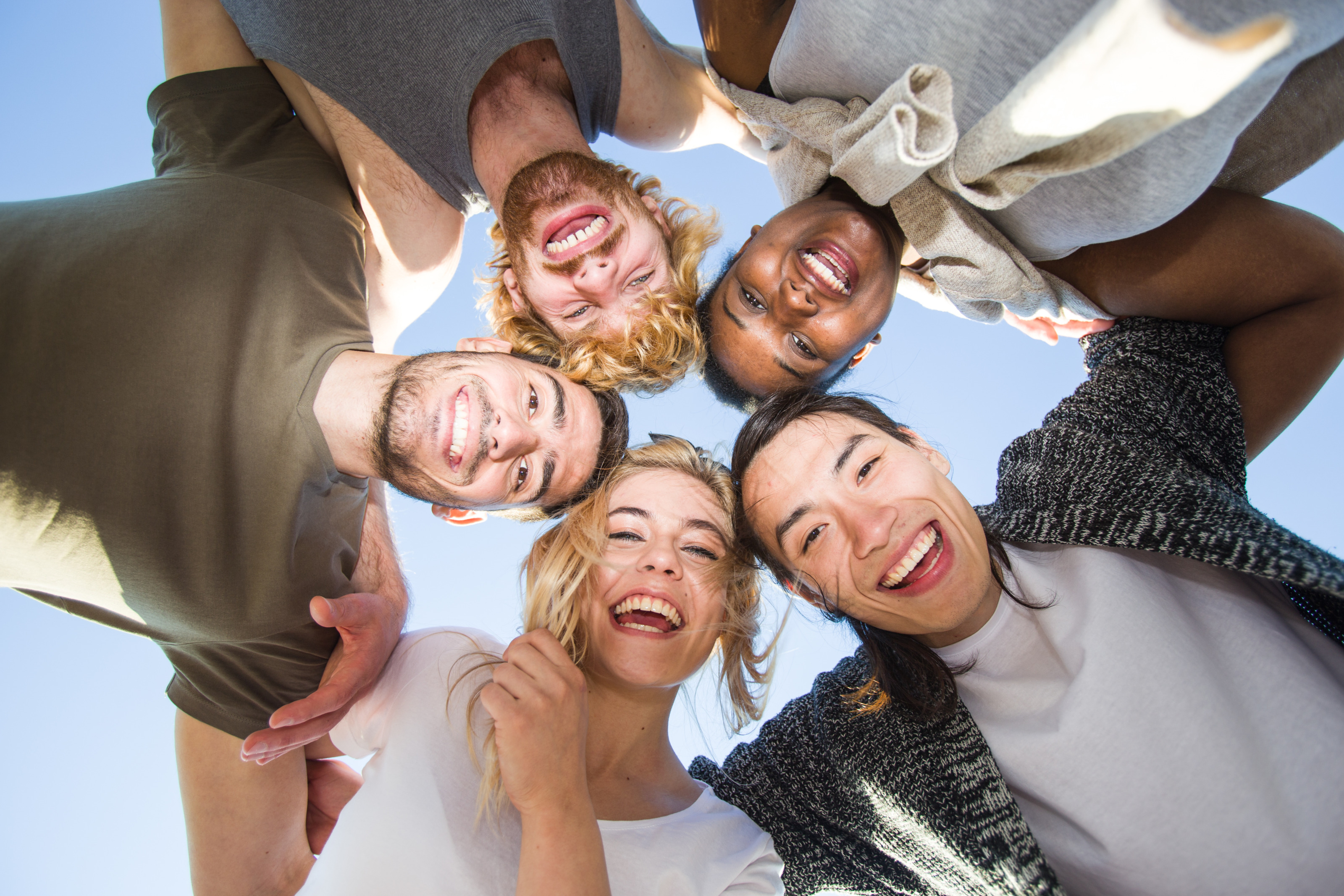 Aufnahme von unten von fünf Personen, die einen Kreis bilden und ihre Köpfe zusammenstecken. Die Köpfe der Personen treffen in der Mitte aufeinander. Die Personen blicken nach unten zur Kamera