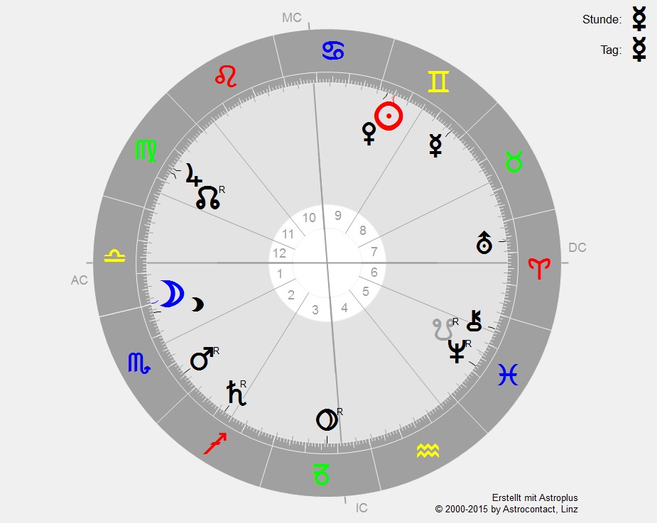 Nebenbei: Der Mond steht denkbar ungünstig. Im letzten Grad des Waagezeichens taumelt er in einem Vakuum, um gleich darauf ins Skorpionzeichen zu wechseln, wo er im Fall steht, also in äußerst wesensfremder Umgebung.