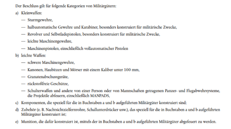 Betroffen davon sind bestimmte Waffen der Gemeinsamen Militärgüterliste der EU (ML1-ML4):