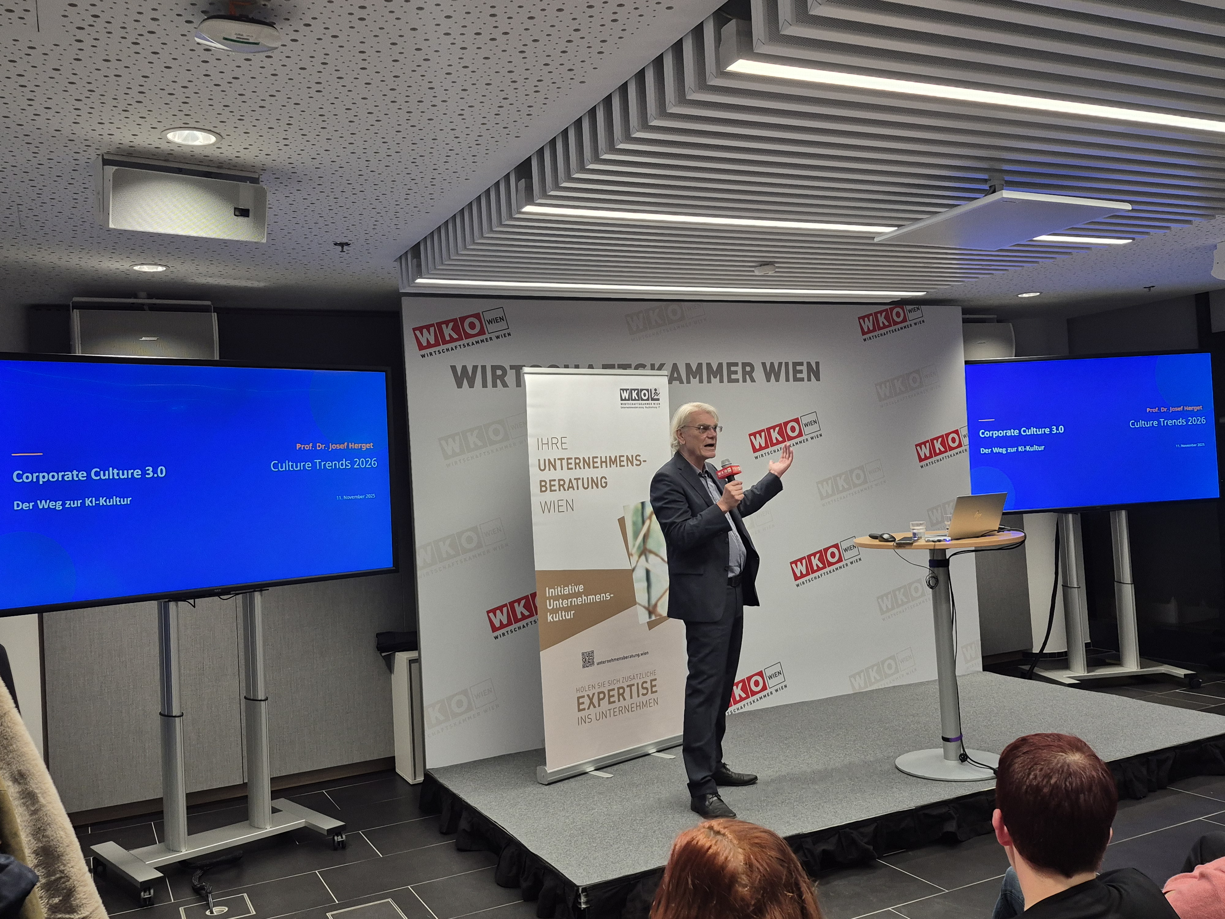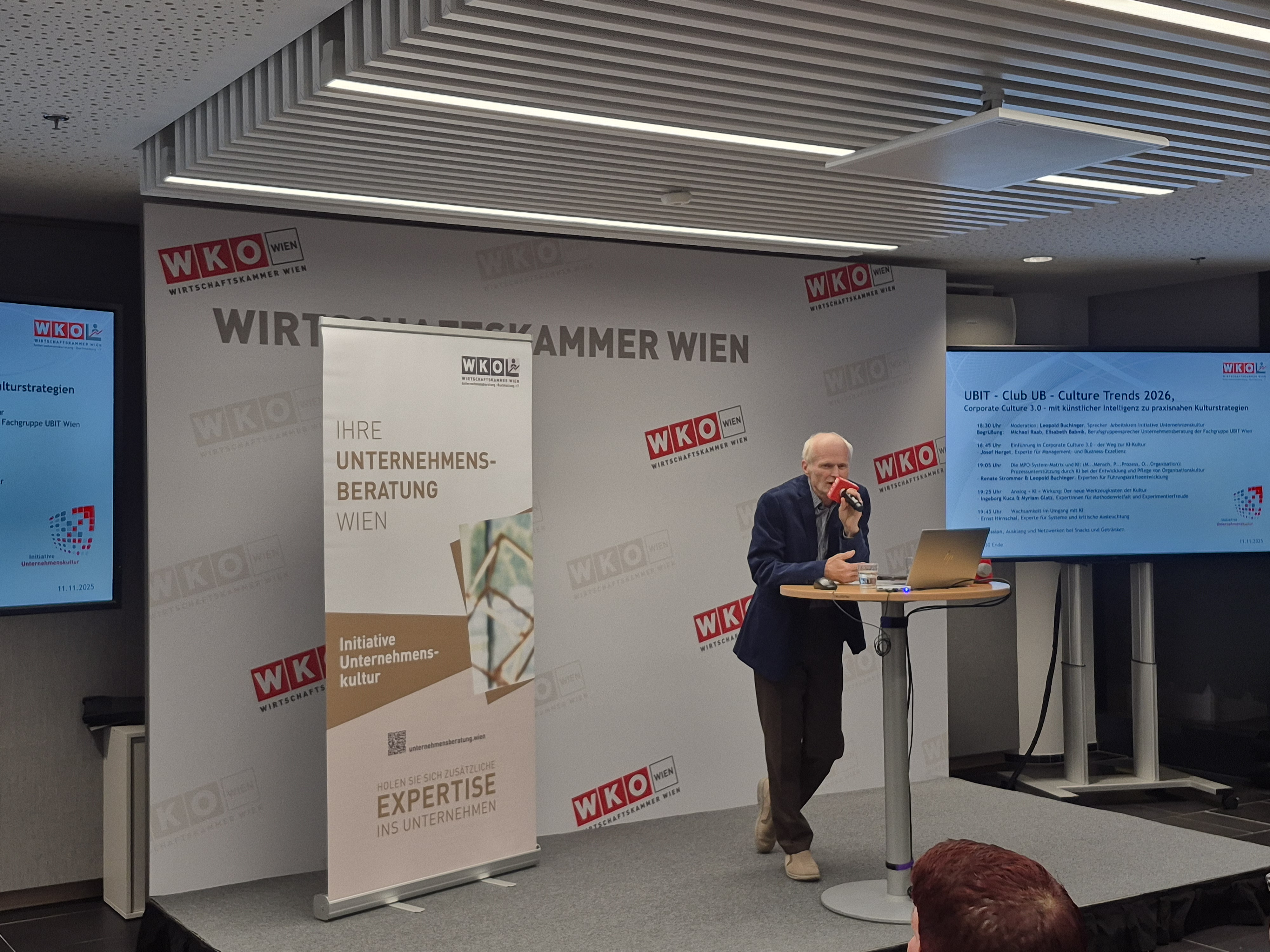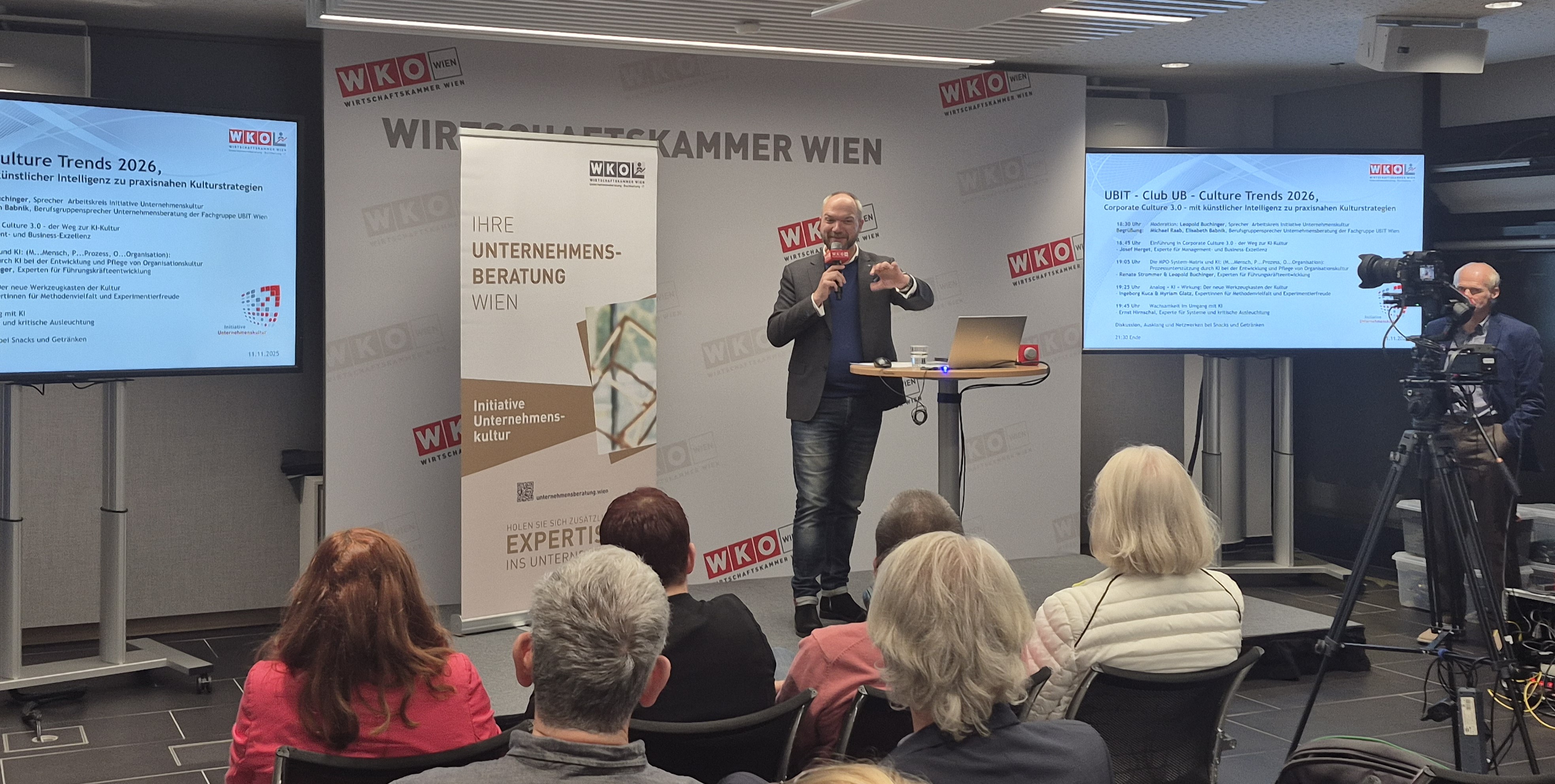 Am 11.11.2025 fand im Haus der Wiener Wirtschaft der Club UB zum Thema Corporate Culture 3.0 – mit künstlicher Intelligenz zu praxisnahen Kulturstrategien statt, initiiert vom Arbeitskreis Initiative Unternehmenskultur. Der Stellvertreter der Berufsgruppensprecherin UB, Michael Raab hat die Teilnehmer:innen begrüßt.