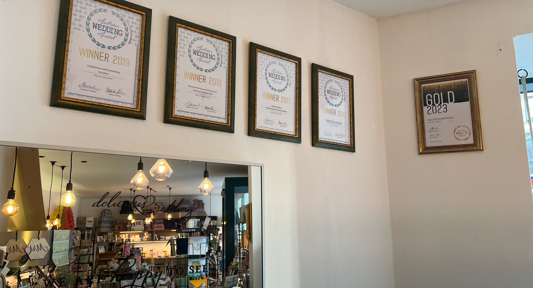Vor allem die Erfolge im Bereich der Hochzeitspapeterie können sich sehen lassen. Hier hat die Firma bereits viele Auszeichnungen erhalten. Das Unternehmen ist stolz und darf sich darüber freuen, dass es bereits ganze 5 mal „mit dem Austrian Wedding Award“ in den Kategorien Hochzeitspapeterie (2016, 2017, 2018, 2023) und beste Innovation (2019) prämiert wurde. Der Award wird oft als Oscar der österreichischen Hochzeitsbranche bezeichnet.