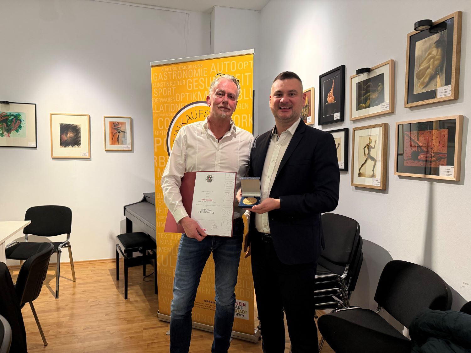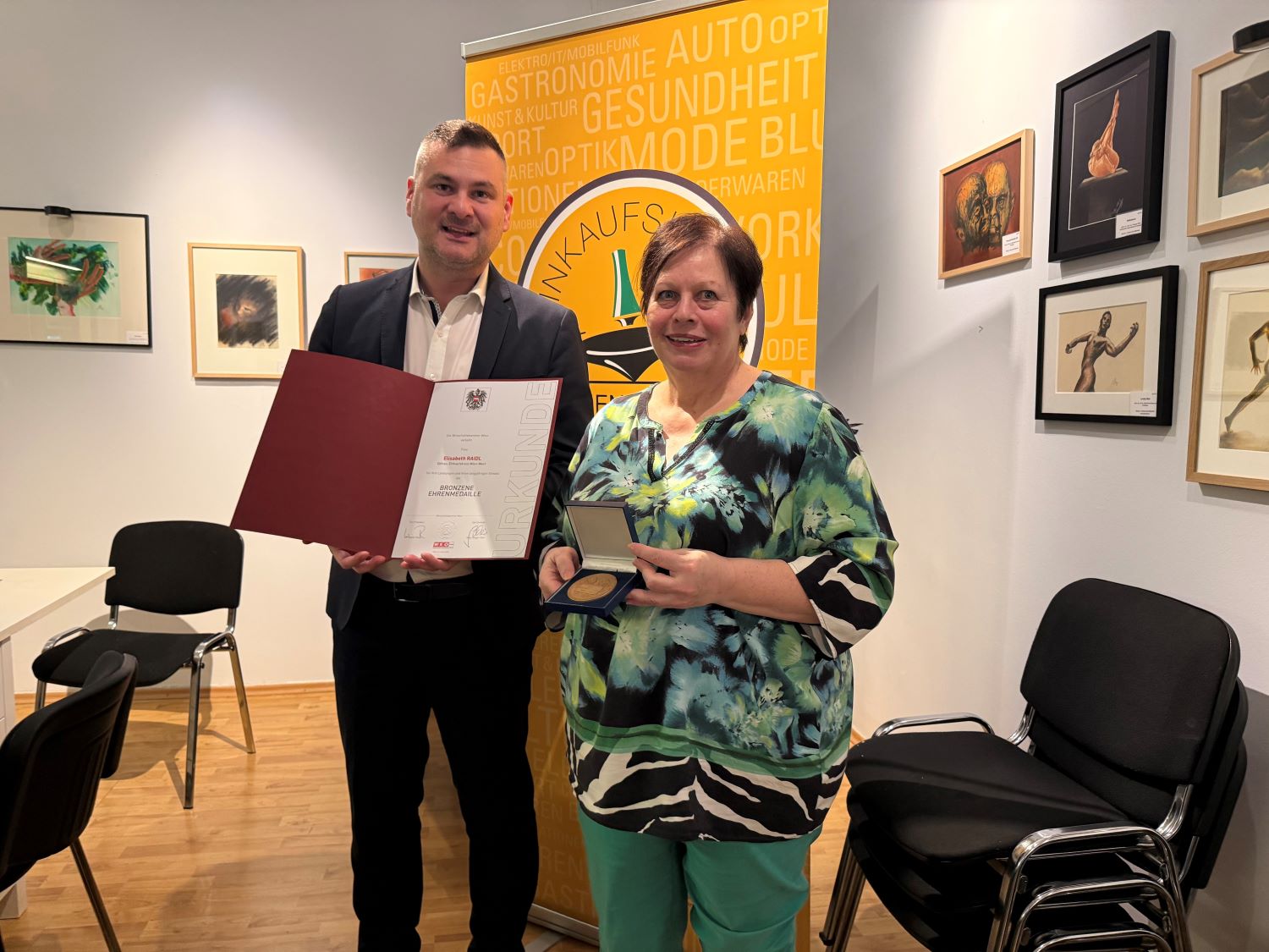 Ein Höhepunkt des Abends war die Ehrung von Obfrau Elisabeth Raidl sowie des langjährigen früheren Obmanns und heutigen Vizeobmanns Peter Schleifer. Beide wurden von der Wirtschaftskammer Wien für ihr langjähriges Engagement zur Stärkung des Wirtschaftsstandorts und die Entwicklung des Einkaufskreises Wien West mit Bronzenen Ehrenmedaille ausgezeichnet. Überreicht wurde die Ehrung von Bezirksobmann Andreas Eisenbock, der an diesem Abend zugleich bekannt gab, seine Funktion als Bezirksobmann zurückzulegen.