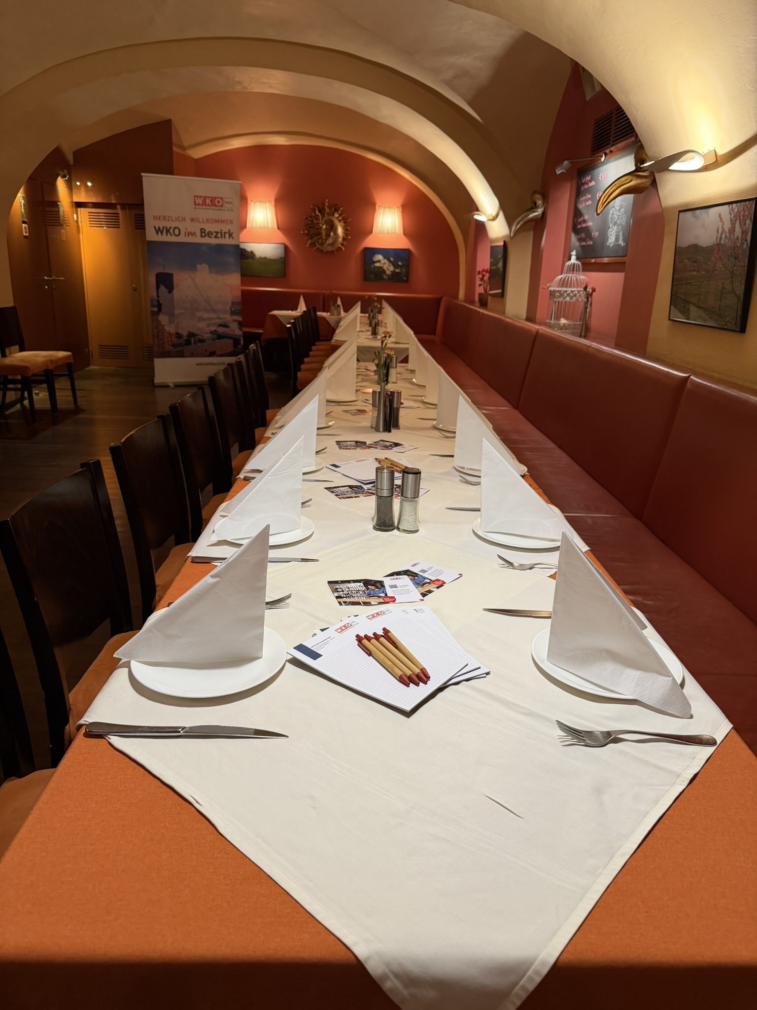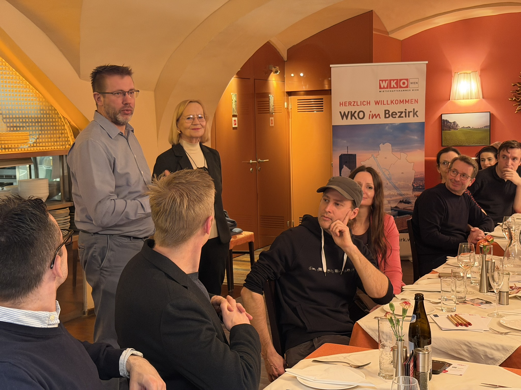 Die Trattoria Margareta überzeugte als Gastgeberbetrieb mit großer Herzlichkeit und trug wesentlich zum gelungenen Vormittag bei. Neben WK-Wien Bezirksobfrau Maria Böhm für Margareten, begrüßte auch Inhaber Jürgen Geyer die Gäste und gab dazu noch einen interessanten Überblick über den Veranstaltungsort. Die Trattoria Margareta ist eines von insgesamt 4 etablierten Lokalen im Schlossquadrat mitten in Margareten. Auch die anderen 3 Gastronomiebetriebe sind auf jeden Fall einen Besuch wert: das traditionsreiche Gasthaus Silberwirt mit klassischer Wiener Küche, das Steak- und Weinlokal Gergely’s sowie das Café Cuadro, das als Café-Bar ein vielseitiges Angebot von Frühstück bis Cocktails bietet.