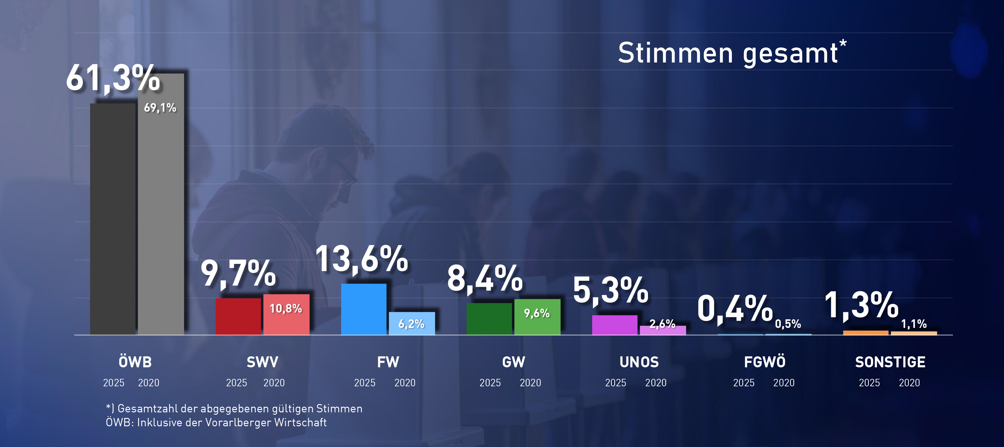 • Österreichischer Wirtschaftsbund (ÖWB): 121.223 oder 61,3 Prozent, das bedeutet ein Minus von 7,9 Prozent gegenüber den Wahlen 2020