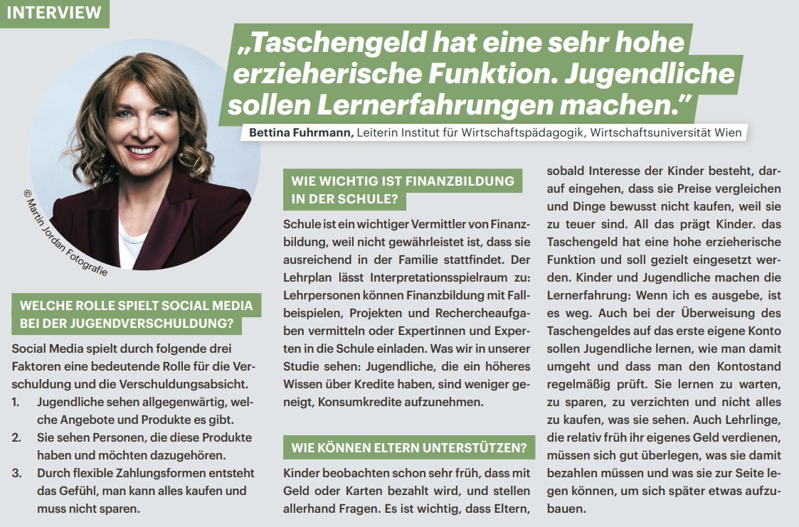 „Der Trend zu ‚buy now, pay later’ spiegelt sich in den Daten wider. Sie zeigen, dass auch junge Menschen schon mit Verschuldungssituationen konfrontiert sind. Jugendliche sollten dementsprechend gut darauf vorbereitet werden, damit sie mit Verschuldung gut umgehen und Überschuldung vermeiden können“, so Dunkl. Bettina Fuhrmann, Leiterin des WU Instituts für Wirtschaftspädagogik, ergänzt: „Ein Hauptproblem ist, dass Jugendliche mit dem Begriff ‚Schulden’ wenig anfangen können. Sie denken, dass nur große Geldbeträge Schulden sein können. Aber Schulden sind natürlich jeder Geldbetrag, den ich mir ausborge und zurückzahlen muss.“