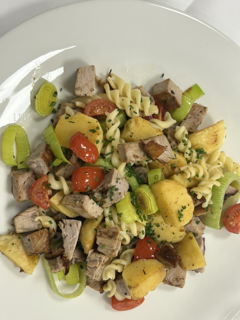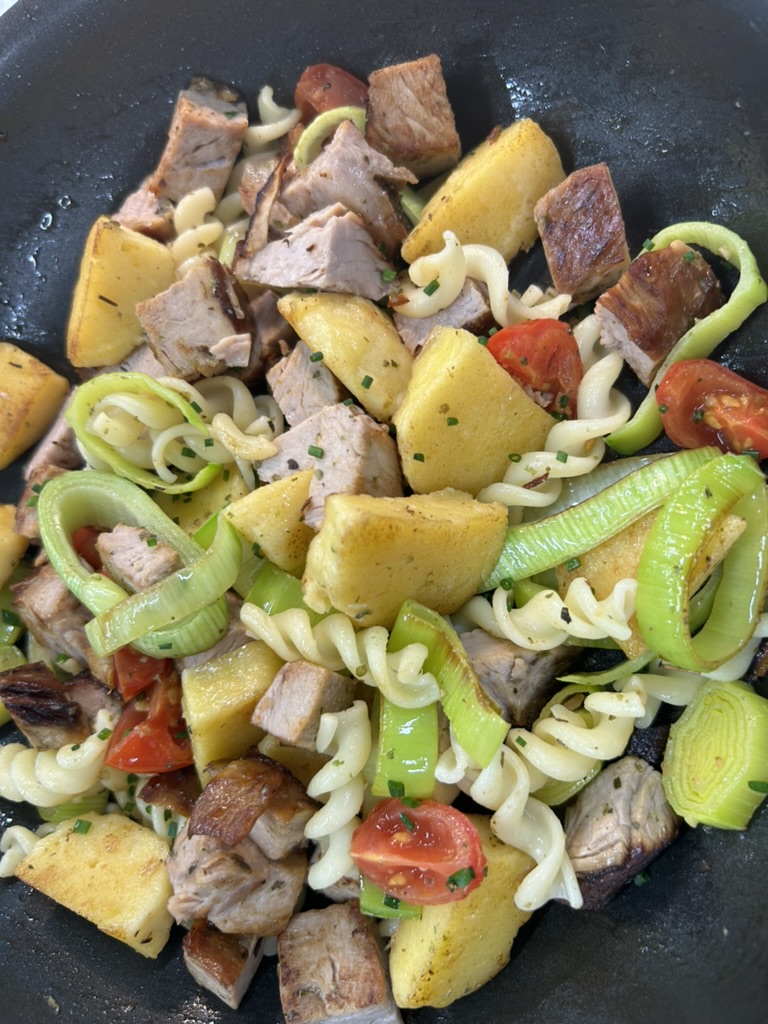 Etwas Ossobuco bleibt übrig: am nächsten Tag in 1 cm große Würfel schneiden. Kartoffelscheiben oder Knödel in Scheiben schneiden. Und ein Gröstl daraus machen.