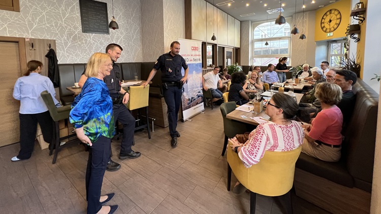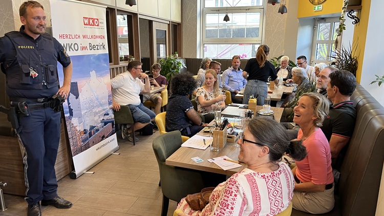Sie informierten über präventive Maßnahmen, Kooperationsmöglichkeiten und standen den Unternehmer:innen für individuelle Fragen zur Verfügung. Dabei wurde auch deutlich, wie wichtig die Kommunikation zwischen Polizei und Betrieben für ein sicheres Grätzl ist.