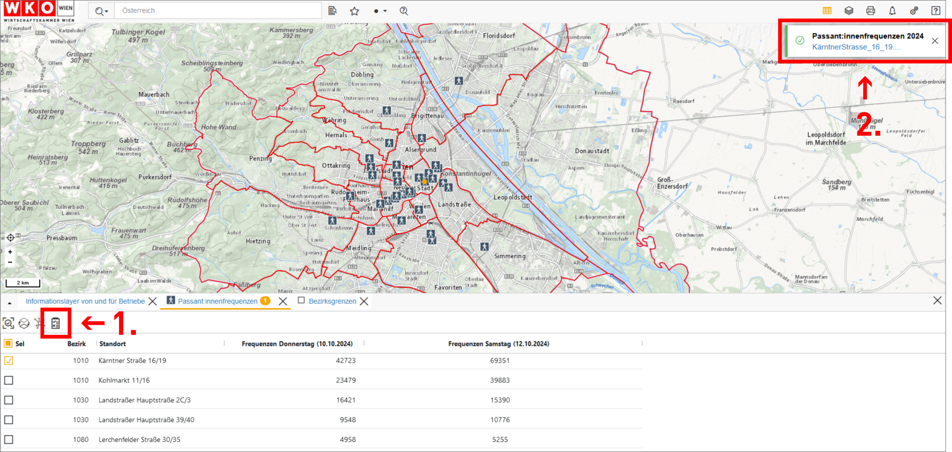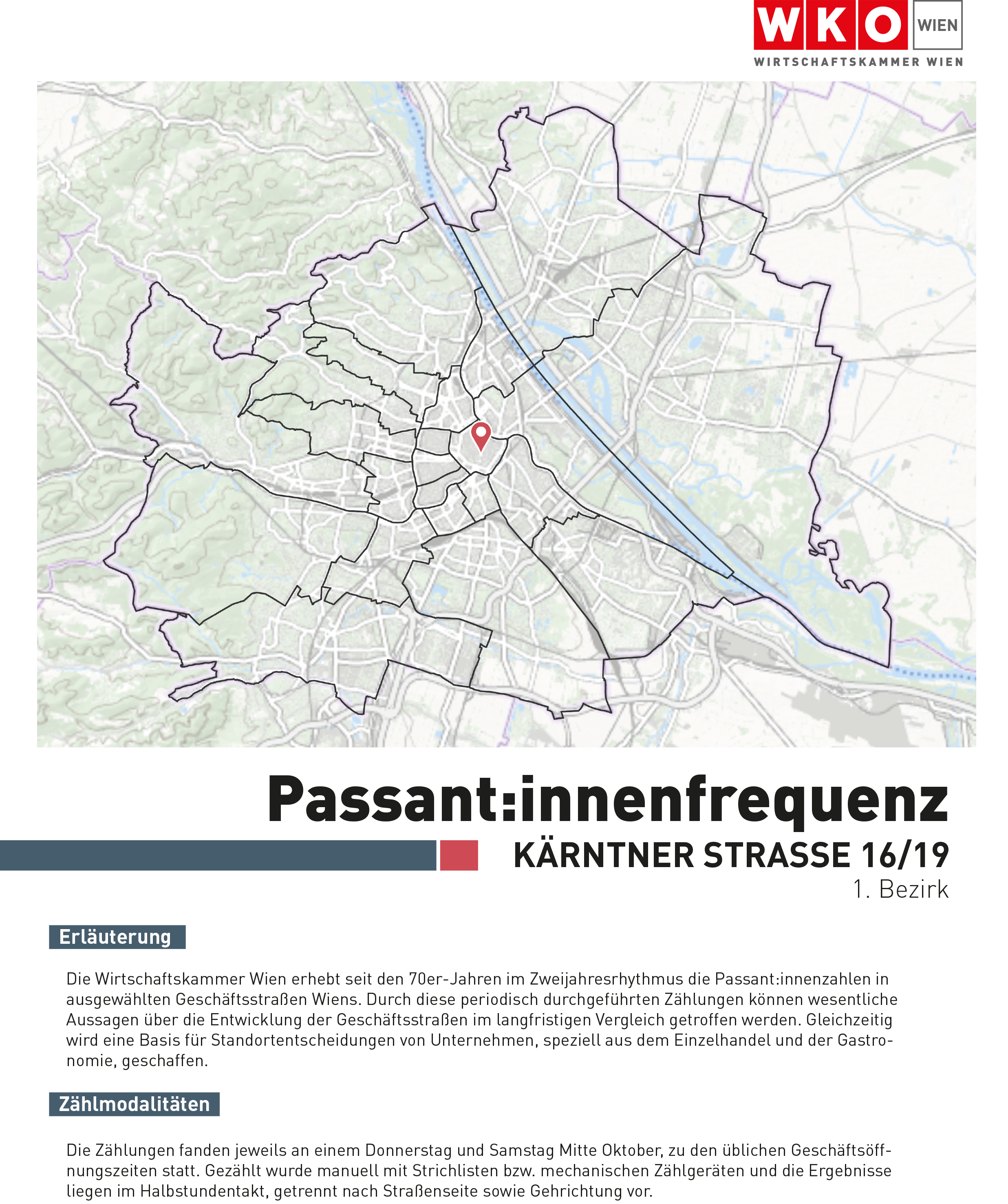 Die Wirtschaftskammer Wien führt seit den frühen 1970er-Jahren in regelmäßigen Abständen Passantenzählungen durch. Sie geben Aufschluss darüber, wie viele potenzielle Kundinnen und Kunden in den Wiener Geschäftsstraßen unterwegs sind. Im Jahr 2024 haben wir an 34 Standorten in 29 Geschäftsstraßen am Donnerstag, den 10. Oktober und Samstag, den 12. Oktober gezählt.