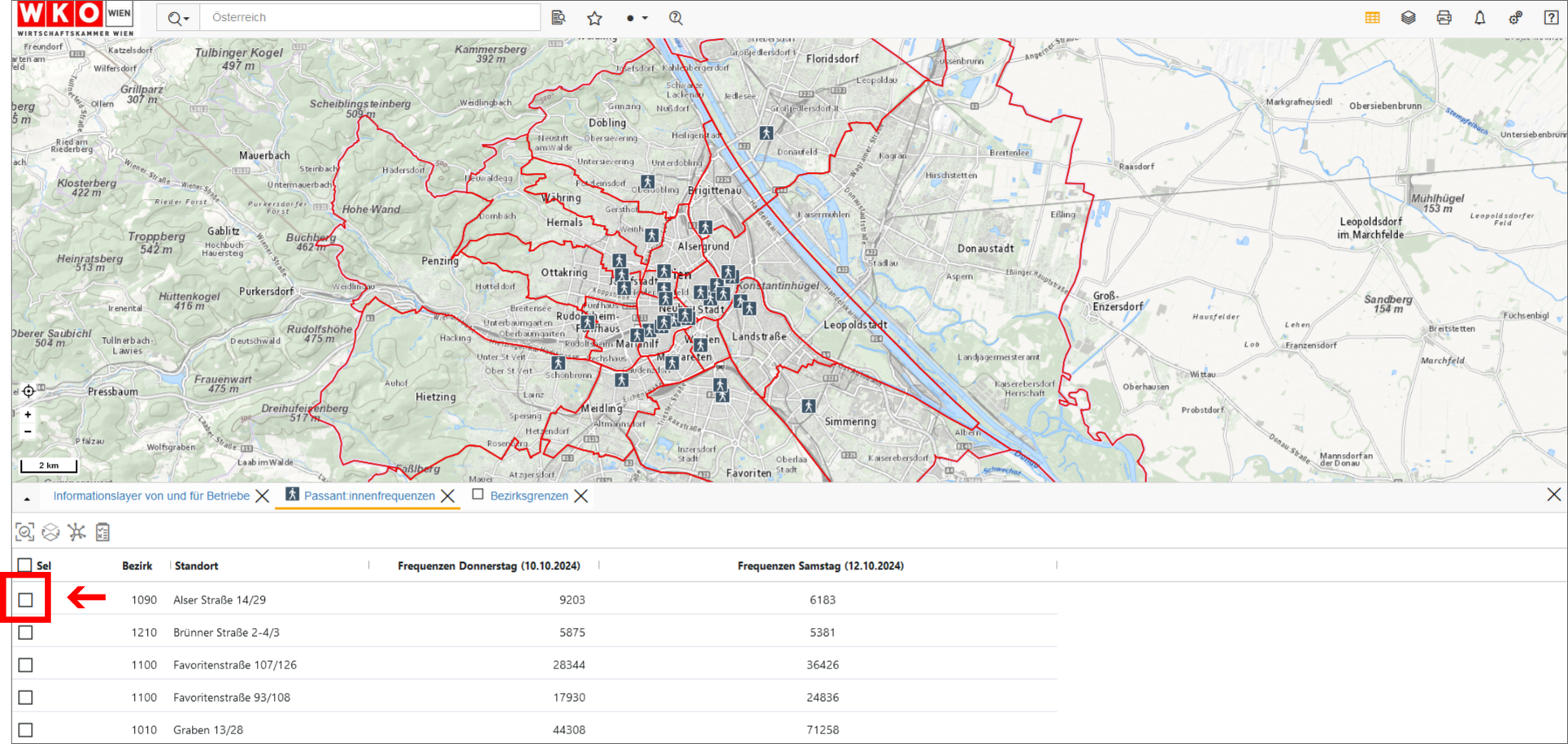 Wählen Sie die Gruppe "Standortinformationen – Passantenfrequenzen", öffnen Sie diese und aktivieren Sie den Datensatz "Passantenfrequenzen".